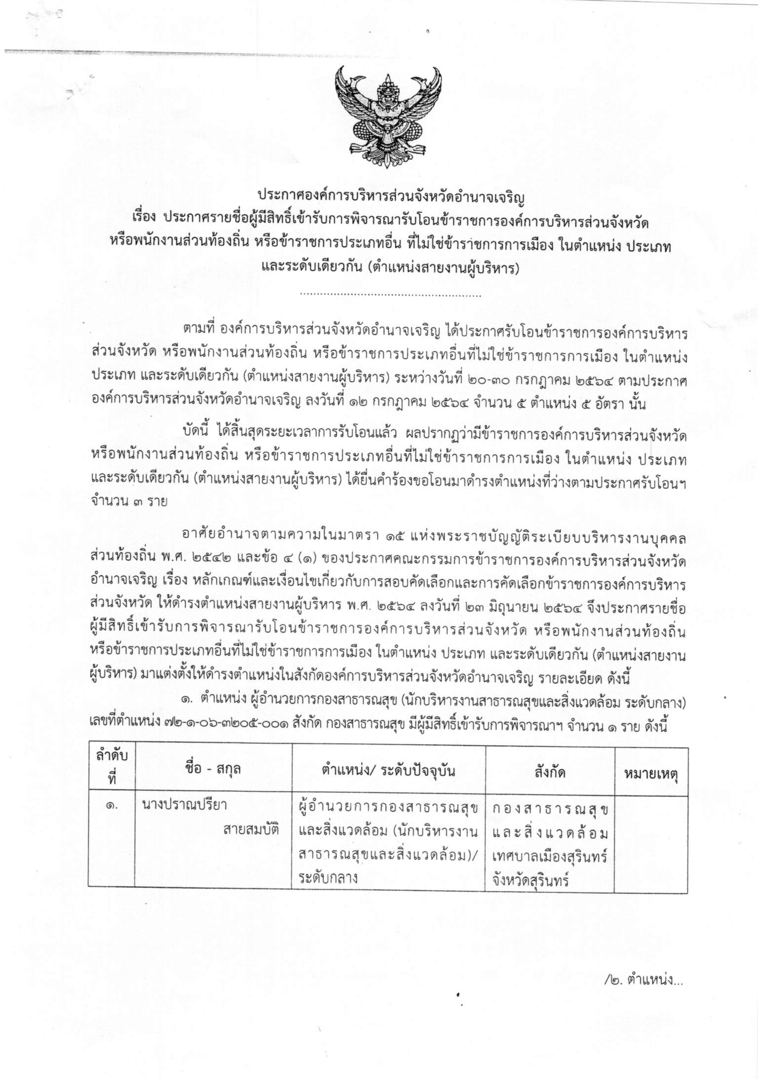ประกาศ เรื่อง ประกาศรายชื่อผู้มีสิทธิ์เข้ารับการพิจารณารับโอนข้าราชการองค์การบริหารส่วนจังหวัด หรือพนักงานส่วนท้องถิ่น หรือข้ารชการประเภทอื่น ที่ไม่ใช่ข้าราชการการเมือง ในตำแหน่ง ประเภทและระดับเดียวกัน (ตำแหน่งสายงานผู้บริหาร) ประกาศ ณ วันที่ 5 ส.ค. 64