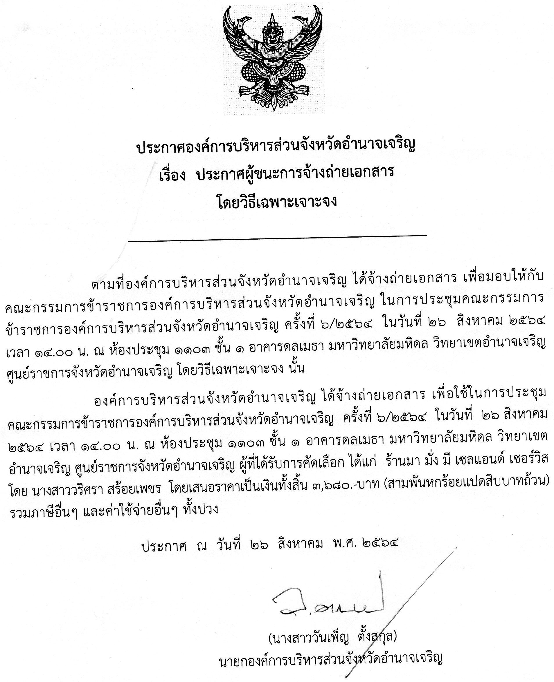 ประกาศผู้ชนะการเสนอราคา จ้างถ่ายเอกสาร โดยวิธีเฉพาะเจาะจง ประกาศ ณ วันที่ 26 ส.ค. 64