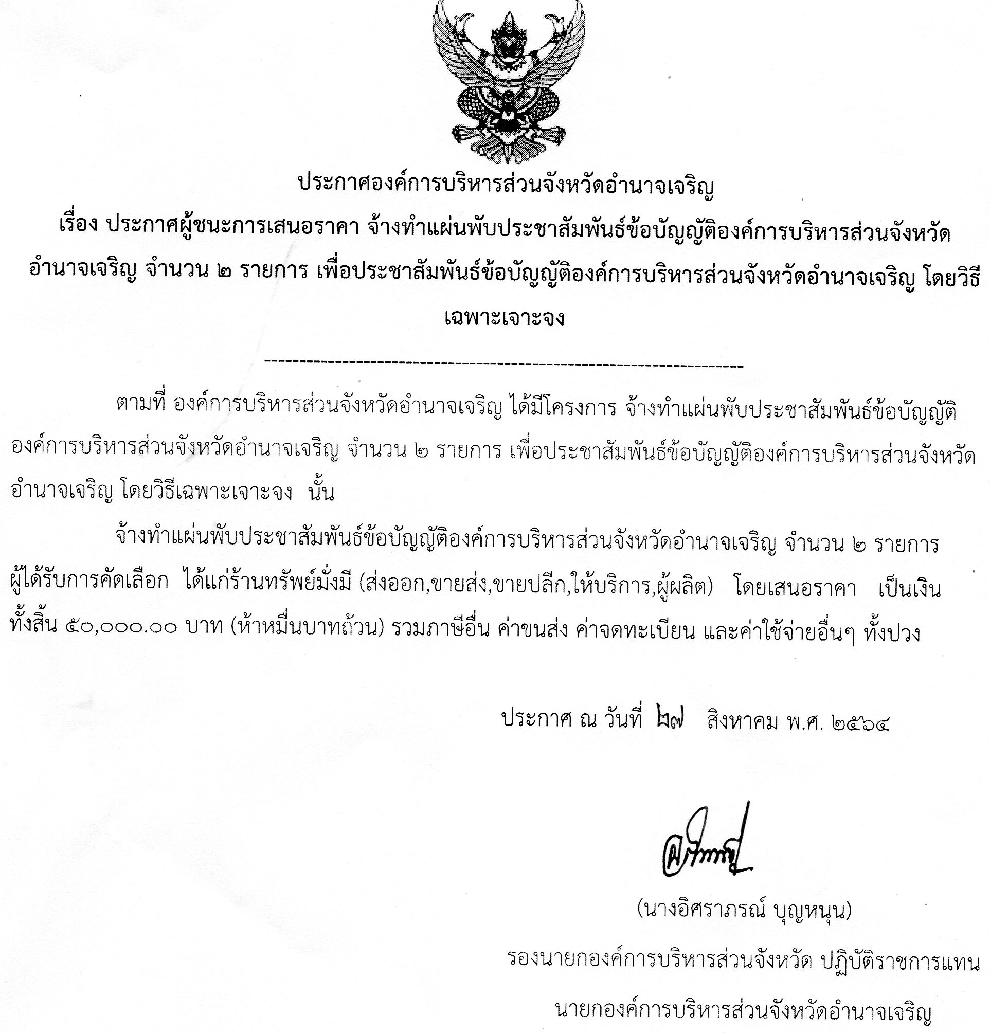 ประกาศผู้ชนะการเสนอราคา จ้างทำแผ่นพับประชาสัมพันธ์ ข้อบัญญัติองค์การบริหารส่วนจังหวัดอำนาจเจริญ จำนวน 2 รายการ เพื่อประชาสัมพันธ์ข้อบัญญัติองค์การบริหารส่วนจังหวัดอำนาจเจริญ โดยวิธีเฉพาะเจาะจง ประกาศ ณ วันที่ 27 ส.ค. 64