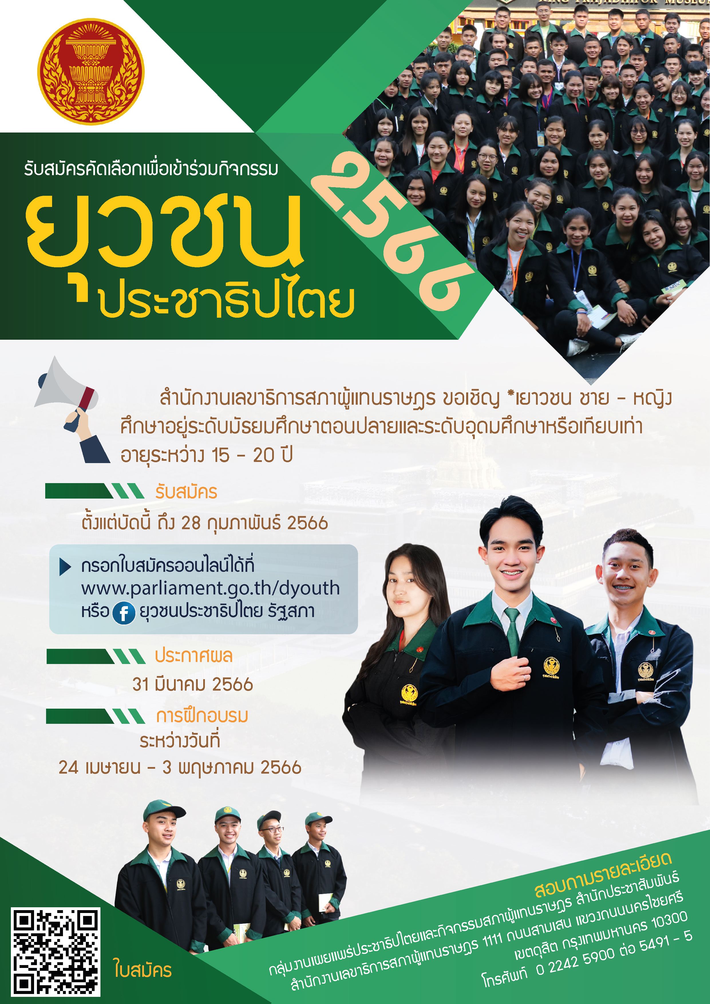 ด้วยสำนักงานเลขาธิการสภาผู้แทนราษฎร จะจัดโครงการส่งเสริมและสนับสนุนความเป็นพลเมืองของเยาวชนในระบอบประชาธิปไตย เพื่อพัฒนาประชาธิปไตยให้ยั่งยืน กิจกรรมยุวชนประชาธิปไตยประจำปีงบประมาณ พ.ศ. ๒๕๖๖ โดยมีวัตถุประสงค์เพื่อให้เยาวชนได้รับองค์ความรู้เชิงบูรณาการ ความเป็นพลเมืองในระบอบประชาธิปไตย วัฒนธรรมทางการเมือง ส่งเสริมการมีส่วนร่วมของเยาวชน และเป็นเครือข่ายด้านประชาธิปไตยของรัฐสภาในการพัฒนาประเทศ พร้อมทั้งเสริมสร้างภาพลักษณ์ที่ดีให้กับสถาบันนิติบัญญัติ มีกลุ่มเป้าหมายเป็นเยาวชนชาย – หญิง ระดับชั้นมัธยมศึกษาตอนปลายหรือเทียบเท่าและนิสิต นักศึกษา ที่มีอายุระหว่าง ๑๕ – ๒๐ ปี จำนวน ๑๖๐ คน โดยจัดอบรมระหว่างวันที่ ๒๔ เมษายน – ๓ พฤษภาคม ๒๕๖๖ ณ สถาบันวิชาการ NT เลขที่ ๑๗๔ ซอยงามวงศ์วาน ๑๗ ถนนงามวงศ์วาน อำเภอเมือง จังหวัดนนทบุรีรายละเอียดข้อมูลโครงการและสื่อประชาสัมพันธ์ตาม QR Code หรือ https://bit.ly/3FWXSD6