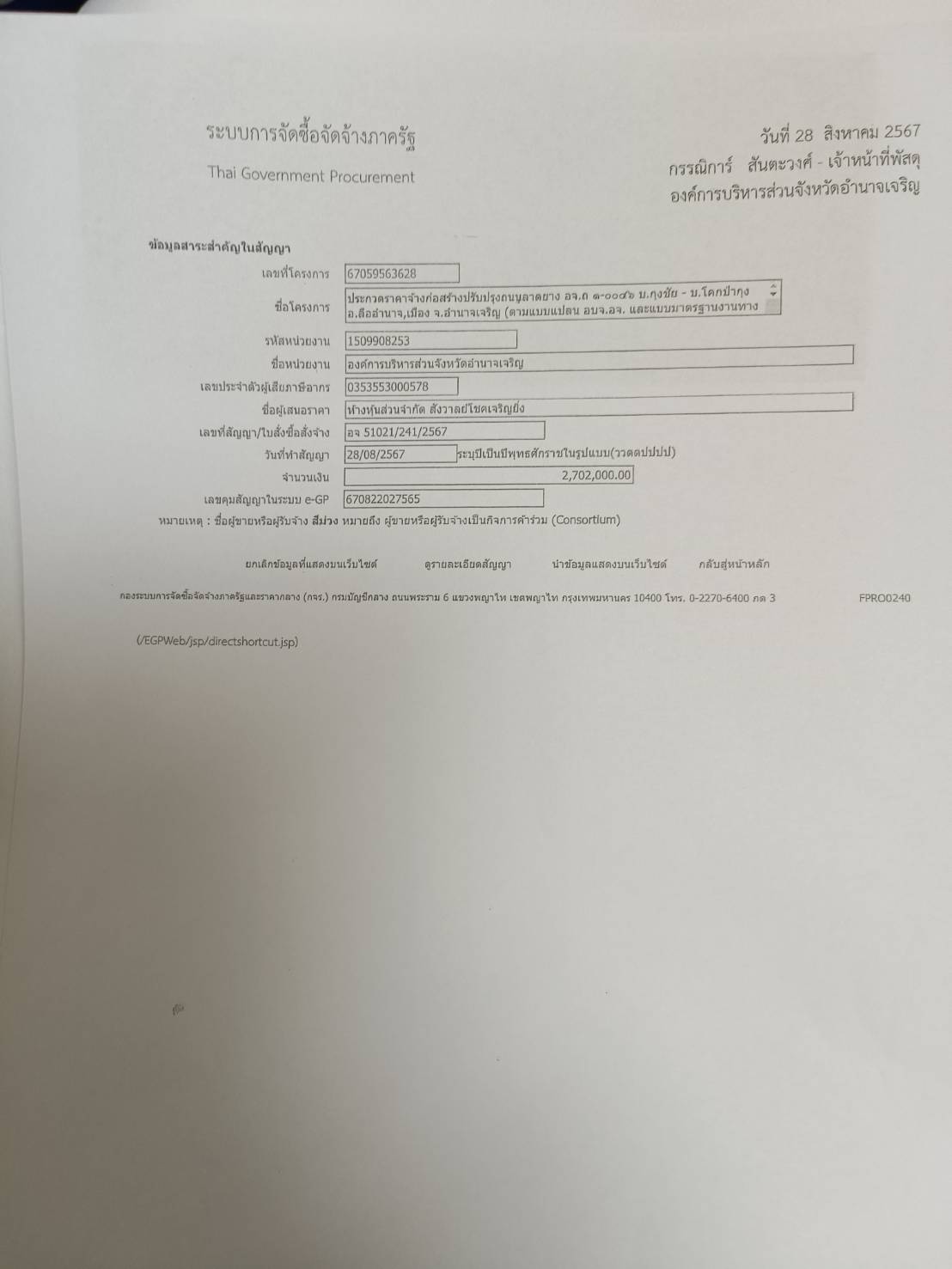 เลขที่โครงการ 67059563628 จ้างก่อสร้างปรับปรุงถนนลาดยาง อจ.ถ 1-0046 บ.กุงชัย - บ.โคกป่ากุง อ.ลืออำนาจ,เมือง จ.อำนาจเจริญ ผิวจราจรลาดยางแอสฟัลต์คอนกรีต หนา 4 ซม. กว้าง 6.00 ม. ไหล่ทางข้างละ 0-1 ม. ยาว 840 ม. หรือมีพื้นที่ไม่น้อยกว่า 6,277.50 ตร.ม. (ตามแบบแปลน อบจ.อจ. และแบบมาตรฐานงานทางสำหรับ อปท. พ.ศ. 2556 กำหนด) วันที่ทำสัญญา 28 ส.ค. 2567