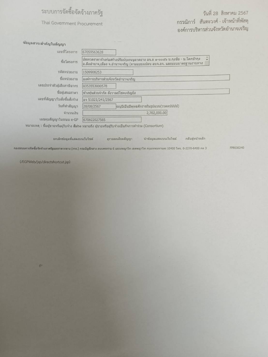 เลขที่โครงการ 67059563628 ประกวดราคาจ้างก่อสร้างปรับปรุงถนนลาดยาง อจ.ถ. 1-0046 บ.กุงชัย- บ.โคกป่ากุง อ.ลืออำนาจ จ.อำนาจเจริญ (ตามแบบแปลน อบจ.อจ. และแบบมาตรฐานงานทางสำหรับ อปท. พ.ศ. 2556 กำหนด) ด้วยวิธีประกวดราคาอิเล็กทรอนิกส์ (e-bidding) และเอกสารประกวดราคาด้วยวิธีประกวดราคา อิเล็กทรอนิกส์ (e-Bidding) วันที่ทำสัญญา 28 ส.ค. 2567