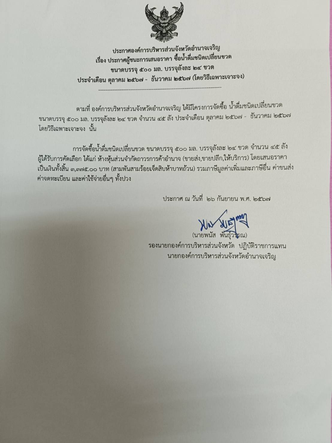 ประกาศผู้ชนะการเสนอราคา จัดซื้อน้ำดื่มชนิดเปลี่ยนขวด บรรจุ 500 มล. บรรจุลังละ 24 ขวด จำนวน 45 ลัง ประจำเดือน ตุลาคม 2567 ถึง เดือน ธันวาคม 2567) โดยวิธีเฉพาะเจาะจง ประกาศ ณ วันที่ 26 กันยายน 2567