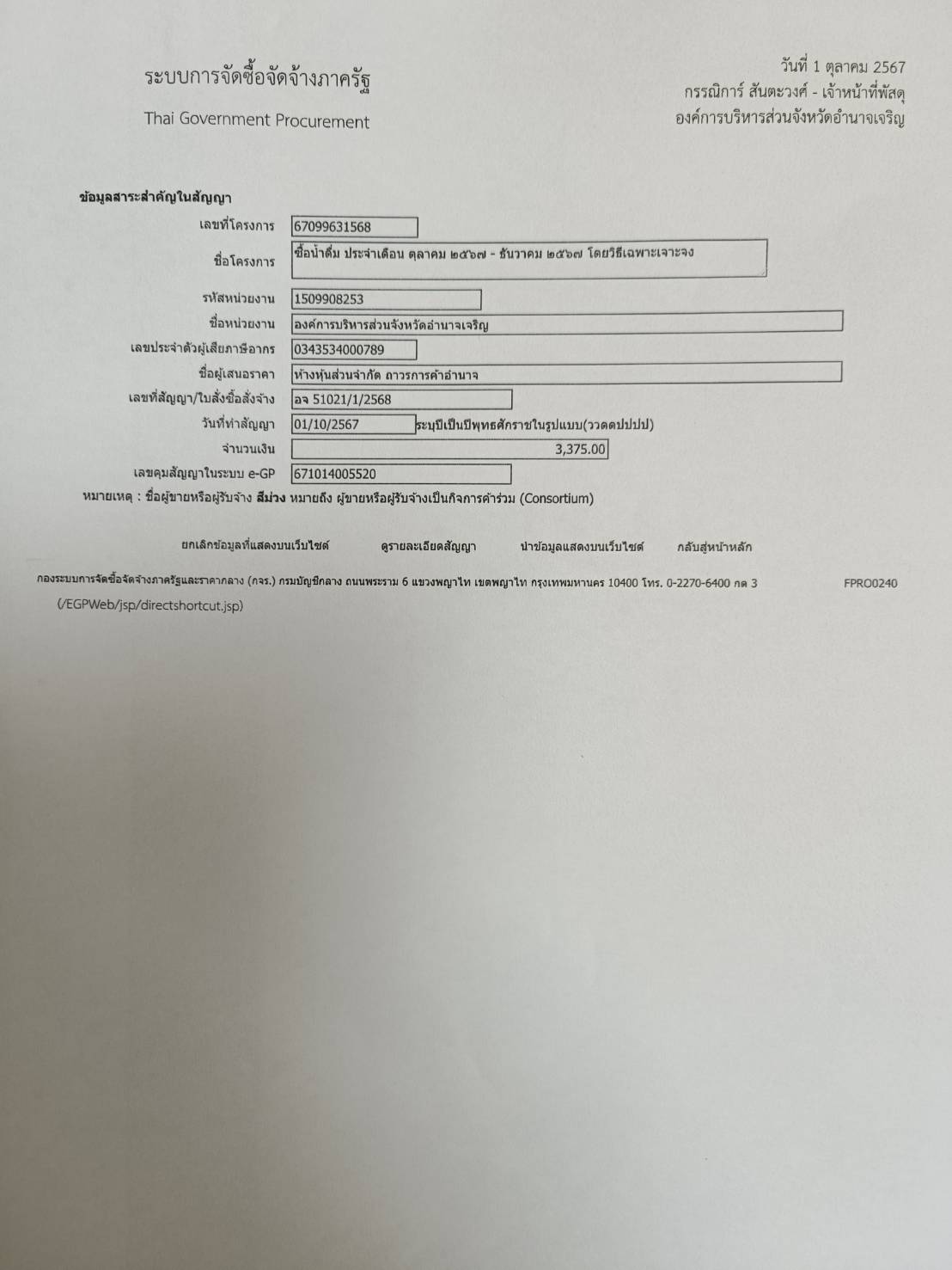 เลขที่โครงการ 67099631568 ซื้อน้ำดื่มประจำเดือน ตุลาคม 2567 - ธันวาคม 2567 โดยวิธีเฉพาะเจาะจง วันที่ทำสัญญา 1 ตุลาคม 2567