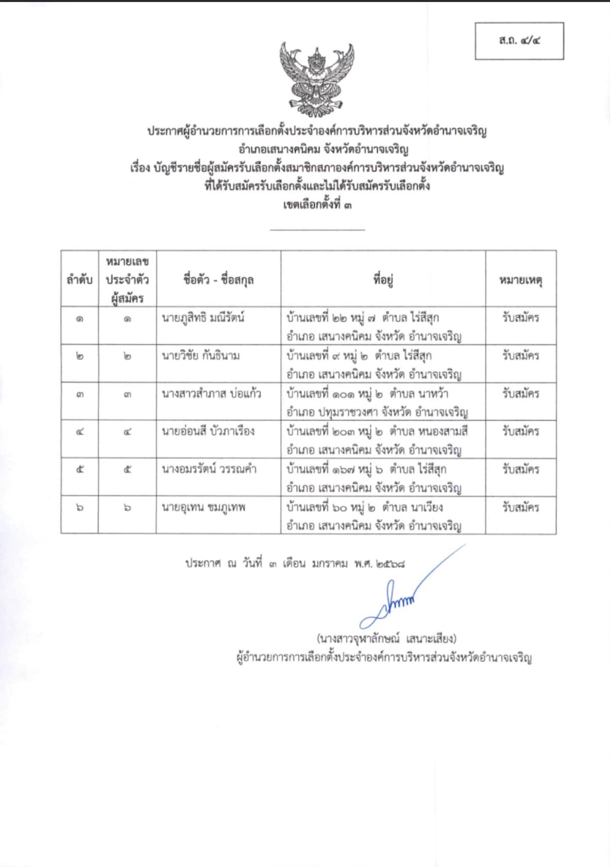ประกาศผู้อำนวยการการเลือกตั้งประจำองค์การบริหารส่วนจังหวัดอำนาจเจริญ เรื่อง ประกาศบัญชีรายชื่อผู้สมัครรับเลือกตั้ง สมาชิกสภา อบจ.อำนาจเจริญ ผู้ที่ได้รับสมัครรับเลือกตั้งฯ และผู้ที่ไม่ได้รับสมัครรับเลือกตั้งฯ (ส.ถ.4/4 และ ส.ถ. 4/5) อำเภอเสนางคนิคม เขตเลือกตั้งที่ 3 “เลือกตั้งท้องถิ่นร่วมกันใช้สิทธิอย่างสุจริตโปร่งใส สร้างสรรค์ประเทศไทยพร้อมใจไปเลือกตั้ง”