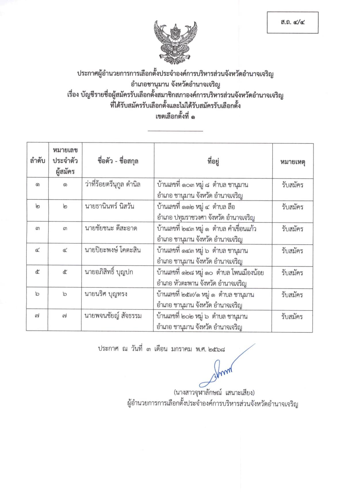 ประกาศผู้อำนวยการการเลือกตั้งประจำองค์การบริหารส่วนจังหวัดอำนาจเจริญ เรื่อง ประกาศบัญชีรายชื่อผู้สมัครรับเลือกตั้ง สมาชิกสภา อบจ.อำนาจเจริญ ผู้ที่ได้รับสมัครรับเลือกตั้งฯ และผู้ที่ไม่ได้รับสมัครรับเลือกตั้งฯ (ส.ถ.4/4 และ ส.ถ. 4/5) อำเภอชานุมาน เขตเลือกตั้งที่ 1 “เลือกตั้งท้องถิ่นร่วมกันใช้สิทธิอย่างสุจริตโปร่งใส สร้างสรรค์ประเทศไทยพร้อมใจไปเลือกตั้ง”