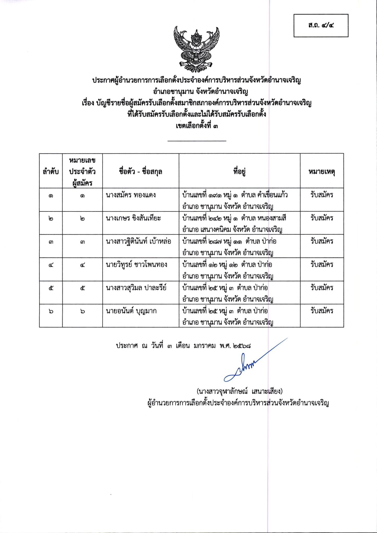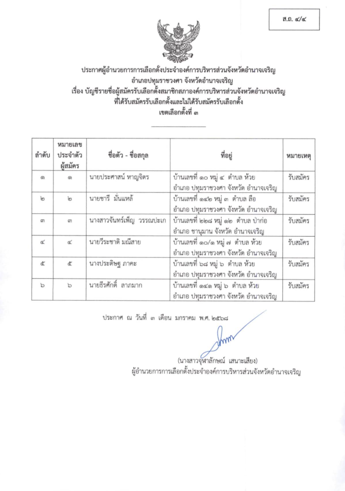 ประกาศผู้อำนวยการการเลือกตั้งประจำองค์การบริหารส่วนจังหวัดอำนาจเจริญ เรื่อง ประกาศบัญชีรายชื่อผู้สมัครรับเลือกตั้ง สมาชิกสภา อบจ.อำนาจเจริญ ผู้ที่ได้รับสมัครรับเลือกตั้งฯ และผู้ที่ไม่ได้รับสมัครรับเลือกตั้งฯ (ส.ถ.4/4 และ ส.ถ. 4/5) อำเภอชานุมาน เขตเลือกตั้งที่ 3 “เลือกตั้งท้องถิ่นร่วมกันใช้สิทธิอย่างสุจริตโปร่งใส สร้างสรรค์ประเทศไทยพร้อมใจไปเลือกตั้ง”