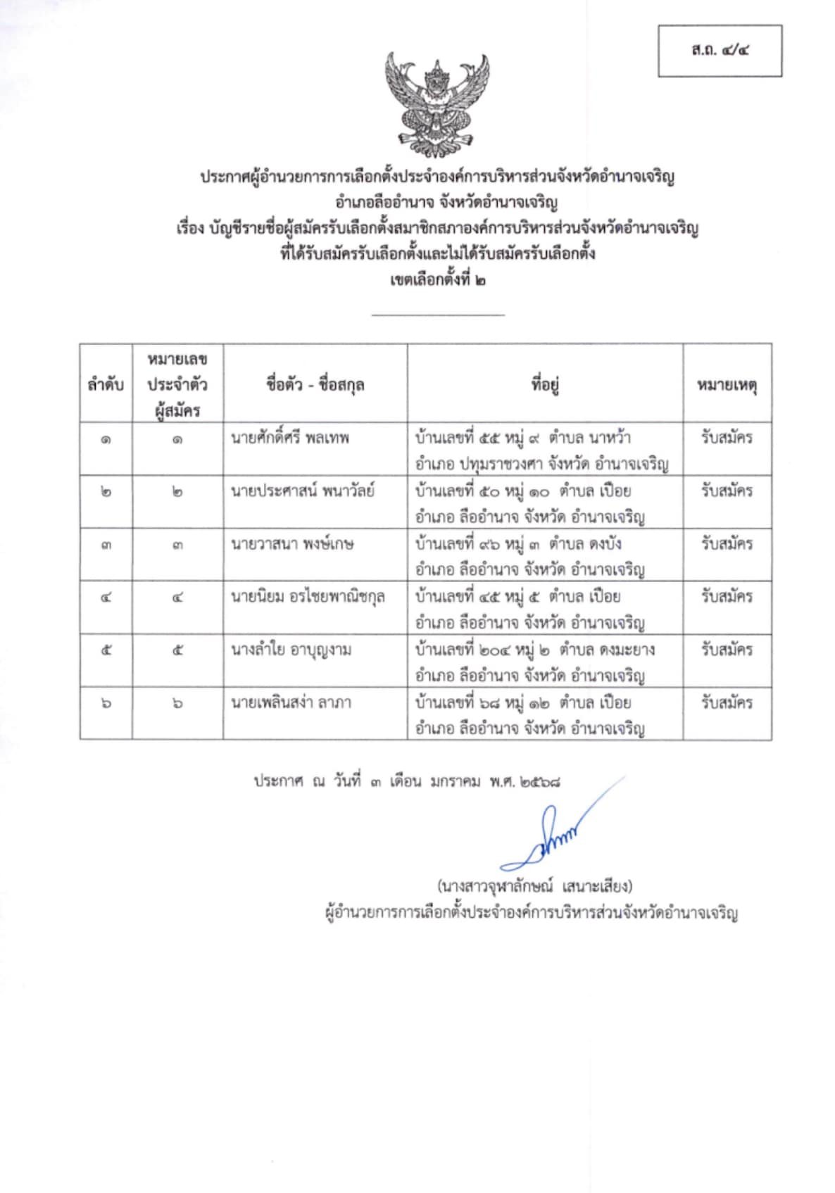 ประกาศผู้อำนวยการการเลือกตั้งประจำองค์การบริหารส่วนจังหวัดอำนาจเจริญ เรื่อง ประกาศบัญชีรายชื่อผู้สมัครรับเลือกตั้ง สมาชิกสภา อบจ.อำนาจเจริญ ผู้ที่ได้รับสมัครรับเลือกตั้งฯ และผู้ที่ไม่ได้รับสมัครรับเลือกตั้งฯ (ส.ถ.4/4 และ ส.ถ. 4/5) อำเภอลืออำนาจ เขตเลือกตั้งที่ 2 “เลือกตั้งท้องถิ่นร่วมกันใช้สิทธิอย่างสุจริตโปร่งใส สร้างสรรค์ประเทศไทยพร้อมใจไปเลือกตั้ง”