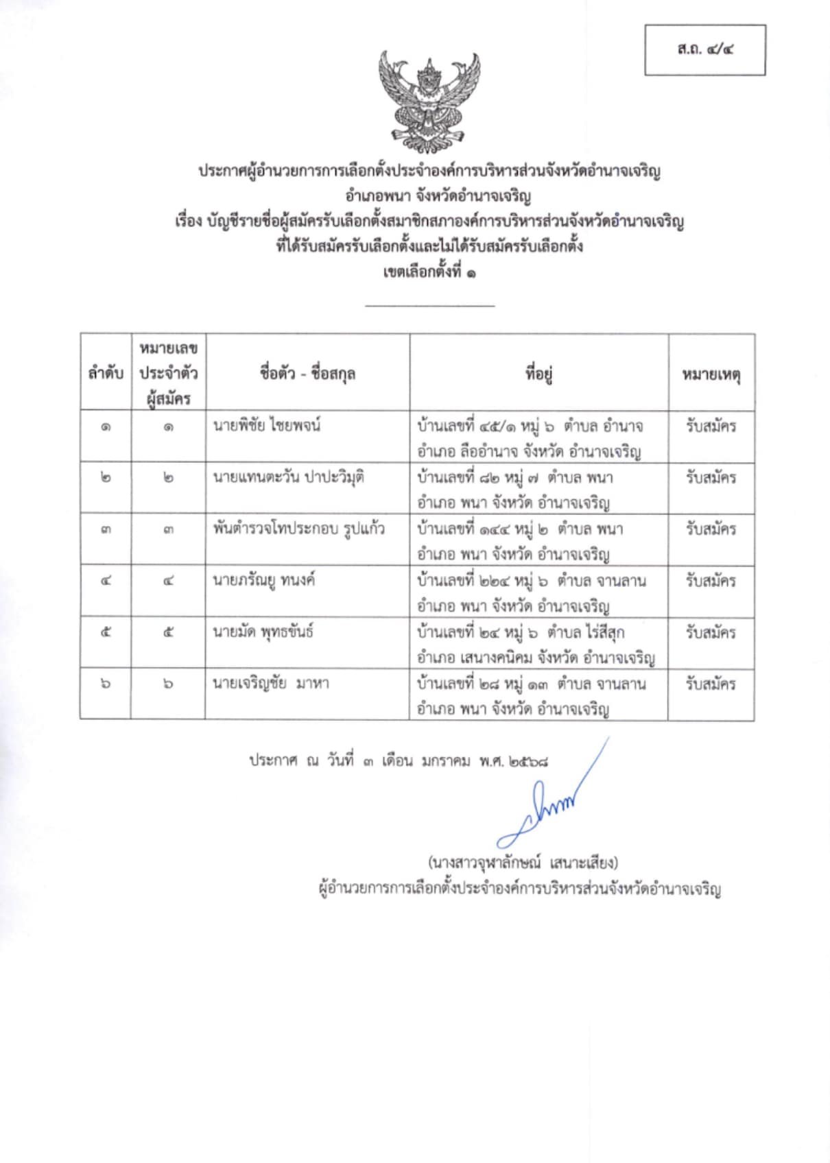 ประกาศผู้อำนวยการการเลือกตั้งประจำองค์การบริหารส่วนจังหวัดอำนาจเจริญ เรื่อง ประกาศบัญชีรายชื่อผู้สมัครรับเลือกตั้ง สมาชิกสภา อบจ.อำนาจเจริญ ผู้ที่ได้รับสมัครรับเลือกตั้งฯ และผู้ที่ไม่ได้รับสมัครรับเลือกตั้งฯ (ส.ถ.4/4 และ ส.ถ. 4/5) อำเภอพนา เขตเลือกตั้งที่ 1 “เลือกตั้งท้องถิ่นร่วมกันใช้สิทธิอย่างสุจริตโปร่งใส สร้างสรรค์ประเทศไทยพร้อมใจไปเลือกตั้ง”