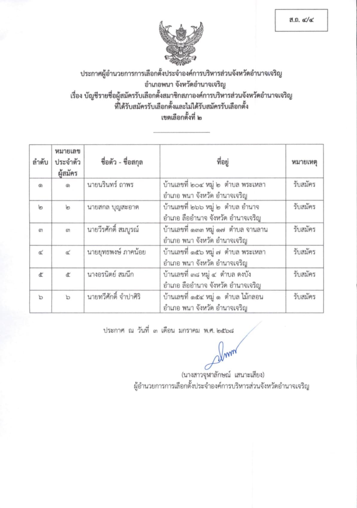 ประกาศผู้อำนวยการการเลือกตั้งประจำองค์การบริหารส่วนจังหวัดอำนาจเจริญ เรื่อง ประกาศบัญชีรายชื่อผู้สมัครรับเลือกตั้ง สมาชิกสภา อบจ.อำนาจเจริญ ผู้ที่ได้รับสมัครรับเลือกตั้งฯ และผู้ที่ไม่ได้รับสมัครรับเลือกตั้งฯ (ส.ถ.4/4 และ ส.ถ. 4/5) อำเภอพนา เขตเลือกตั้งที่ 2 “เลือกตั้งท้องถิ่นร่วมกันใช้สิทธิอย่างสุจริตโปร่งใส สร้างสรรค์ประเทศไทยพร้อมใจไปเลือกตั้ง”