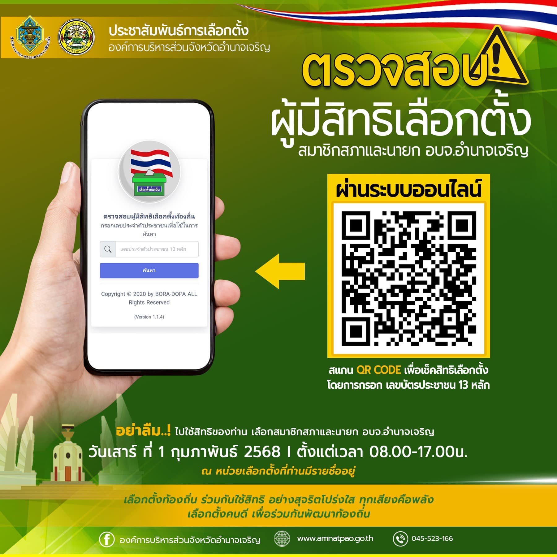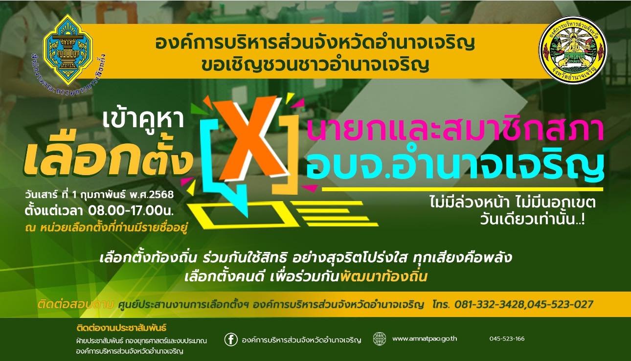อบจ.อำนาจเจริญ | ประชาสัมพันธ์การเลือกตั้ง ขอเชิญชาวอำนาจเจริญผู้มีสิทธิเลือกตั้ง มาใช้สิทธิเลือกตั้งสมาชิกสภา และ นายก อบจ.อำนาจเจริญ ในเสาร์ที่ 1 กุมภาพันธ์ 2568 ตั้งแต่เวลา 08.00 - 17.00 น. ณ หน่วยเลือกตั้งที่ท่านมีชื่ออยู่