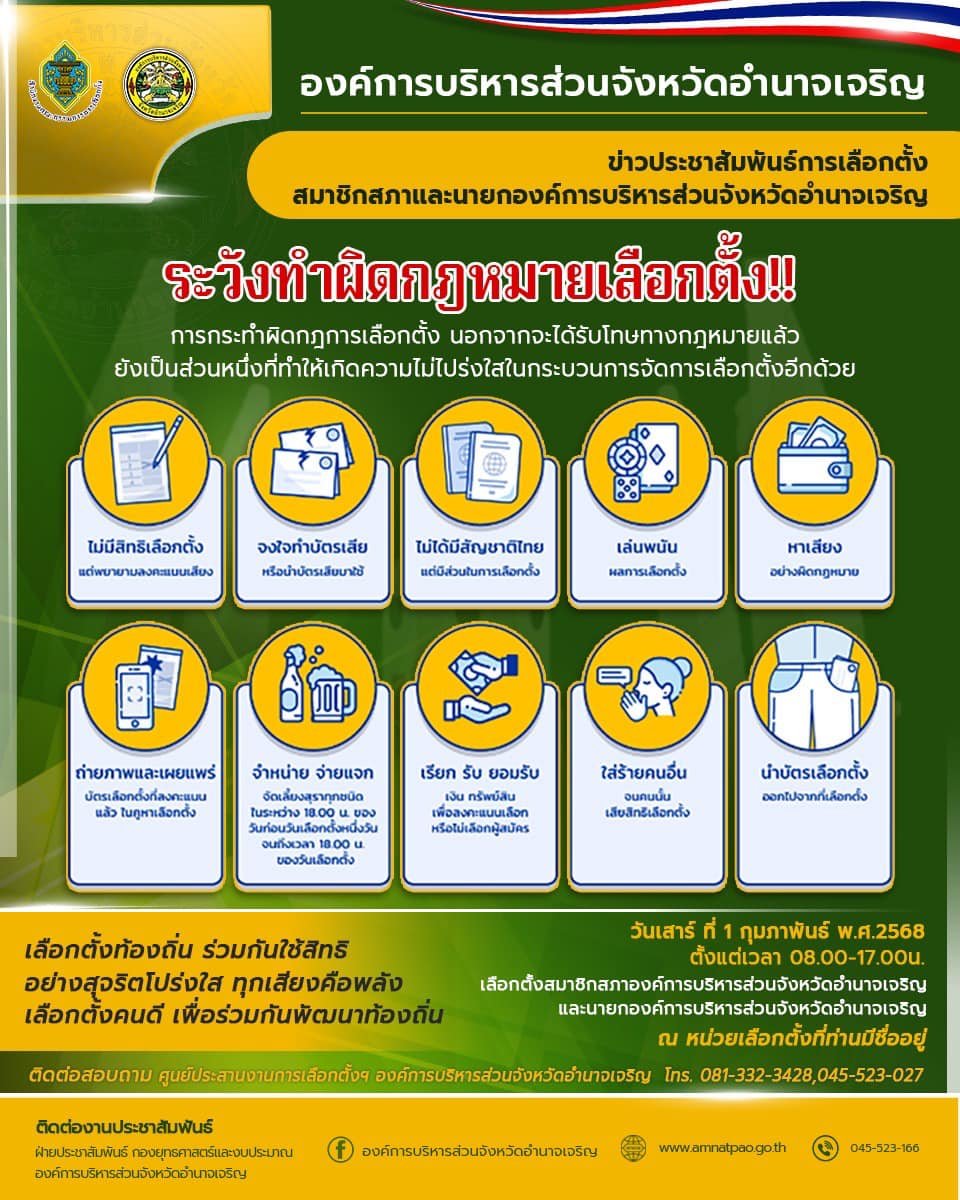 อบจ.อำนาจเจริญ | ประชาสัมพันธ์การเลือกตั้ง แจ้งระวังทำผิดกฏหมายเลือกตั้ง