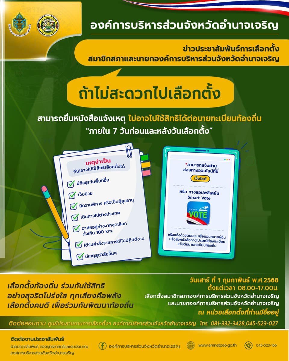 อบจ.อำนาจเจริญ | ประชาสัมพันธ์การเลือกตั้ง ถ้าไม่สะดวกไม่เลือกตั้ง สามารถยื่นหนังสือแจ้งเหตุ ไม่อาจไปใช้สิทธิเลือกตั้งได้ต่อนายทะเบียนท้องถิ่น “ภายใน 7 วันก่อนและหลังวันเลือกตั้ง”
