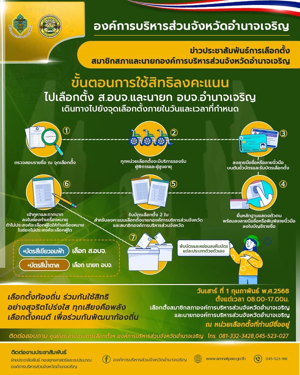อบจ.อำนาจเจริญ | ประชาสัมพันธ์การเลือกตั้ง ขั้นตอนการใช้สิทธิลงคะแนนเลือกตั้งสมาชิกสภา และ นายก อบจ.อำนาจเจริญ ในวันเสาร์ที่ 1 กุมภาพันธ์ 2568 ตั้งแต่เวลา 08.00 - 17.00 น. ณ หน่วยเลือกตั้งที่ท่านมีชื่ออยู่