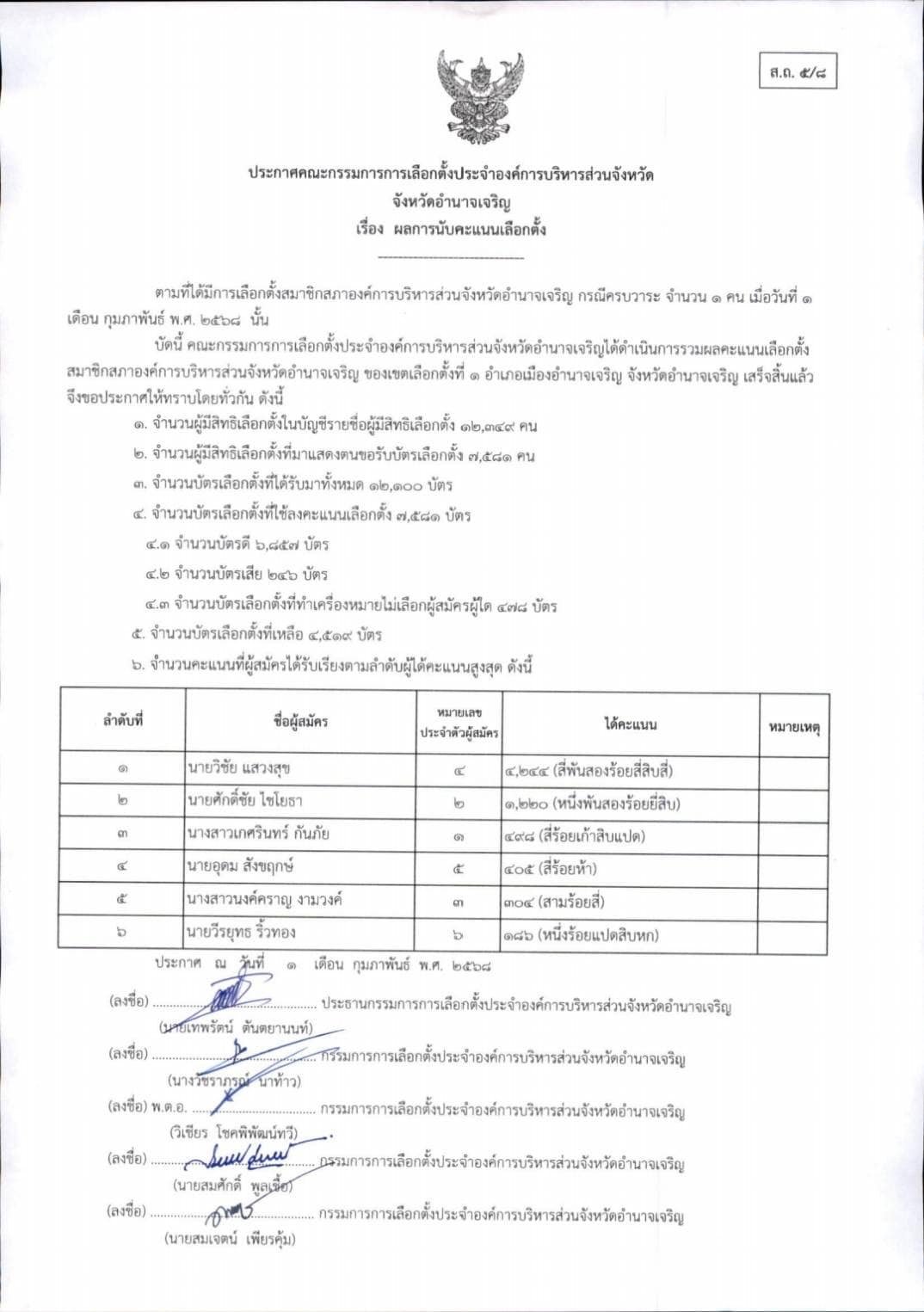 ประกาศคณะกรรมการการเลือกตั้ง เรื่อง ผลการเลือกตั้งสมาชิกสภาองค์การบริหารส่วนจังหวัดและนายกองค์การบริหารส่วนจังหวัดอำนาจเจริญ
