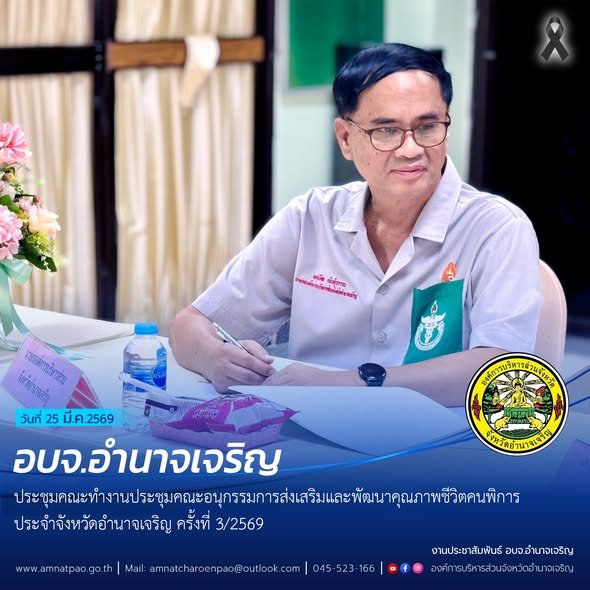 วันที่ 25 มีนาคม 2569 เวลา 13.30 น. อบจ.อำนาจเจริญ ร่วมประชุมคณะอนุกรรมการส่งเสริมคุณภาพชีวิตคนพิการประจำจังหวัดอำนาจเจริญ ครั้งที่3/2569