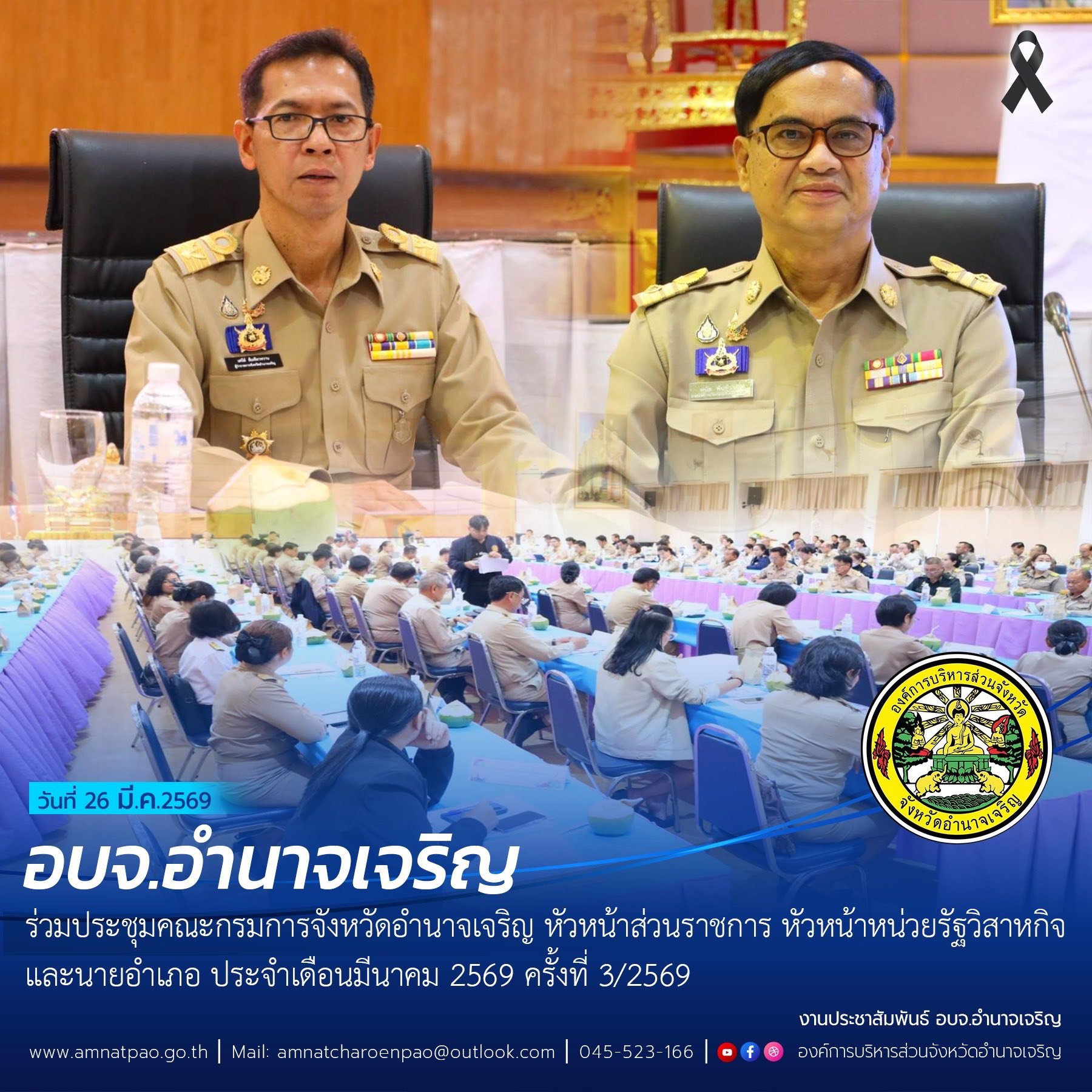 วันที่ 26 มีนาคม 2569 เวลา 09.30 น. อบจ.อำนาจเจริญ ร่วมประชุมคณะกรมการจังหวัดอำนาจเจริญ หัวหน้าส่วนราชการ หัวหน้ารัฐวิสาหกิจ และ นายอำเภอ ประจำเดือน มีนาคม 2569 ครั้งที่ 3/2569