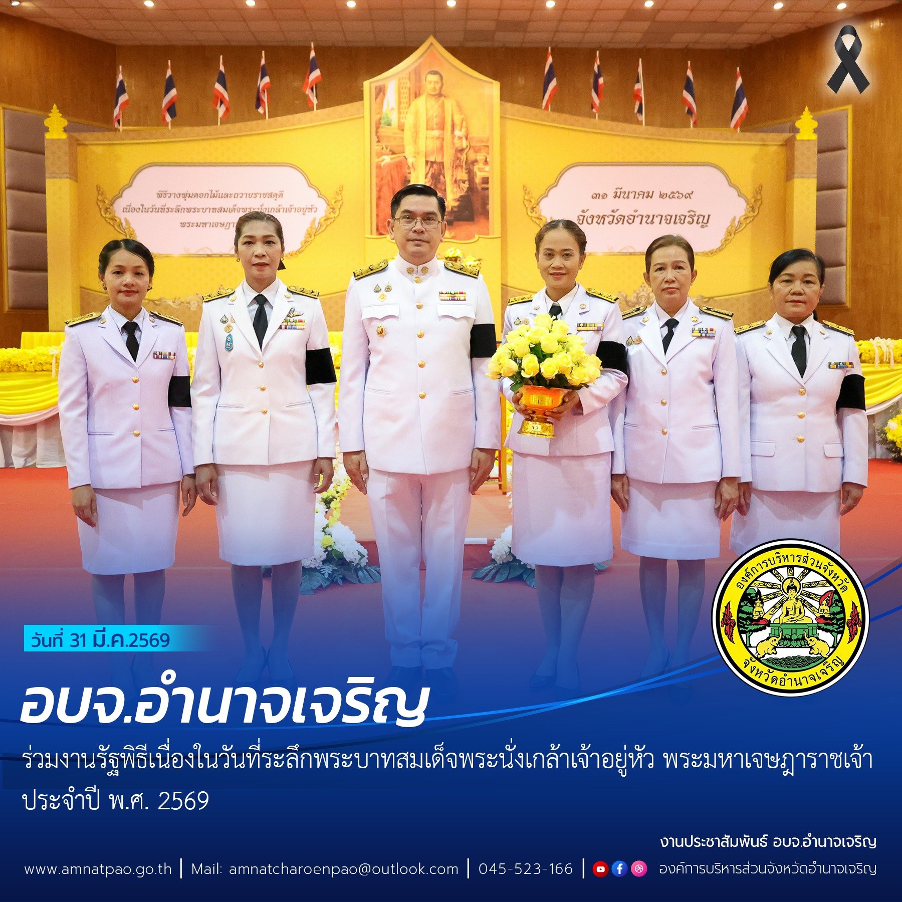 วันที่ 2 เมษายน 2569 เวลา 07.00 น. อบจ.อำนาจเจริญ ร่วมงานกิจกรรมเนื่องในวันคล้ายวันพระราชสมภพสมเด็จพระกนิษฐาธิราชเจ้า กรมสมเด็จพระเทพรัตนราชสุดาฯ สยามบรมราชกุมารี ประจำปี 2569