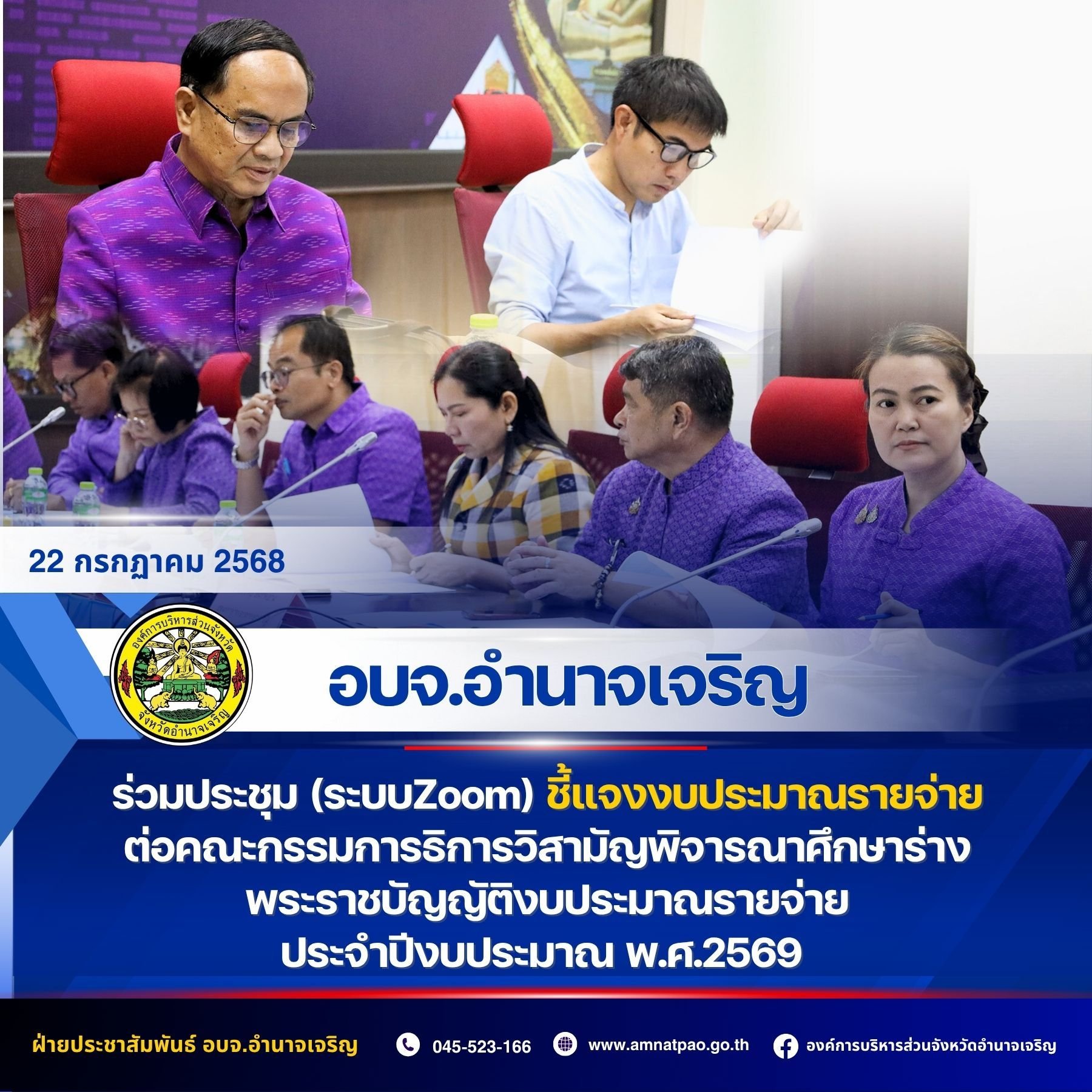วันที่ 22 กรกฎาคม 2568 เวลา 12.00 น. อบจ.อำนาจเจริญ ประชุมชี้แจงงบฯ สมาชิกสภาผู้แทนราษฎร ผ่านระบบ Zoom. ร่วมกับ เทศบาลเมืองอำนาจเจริญ