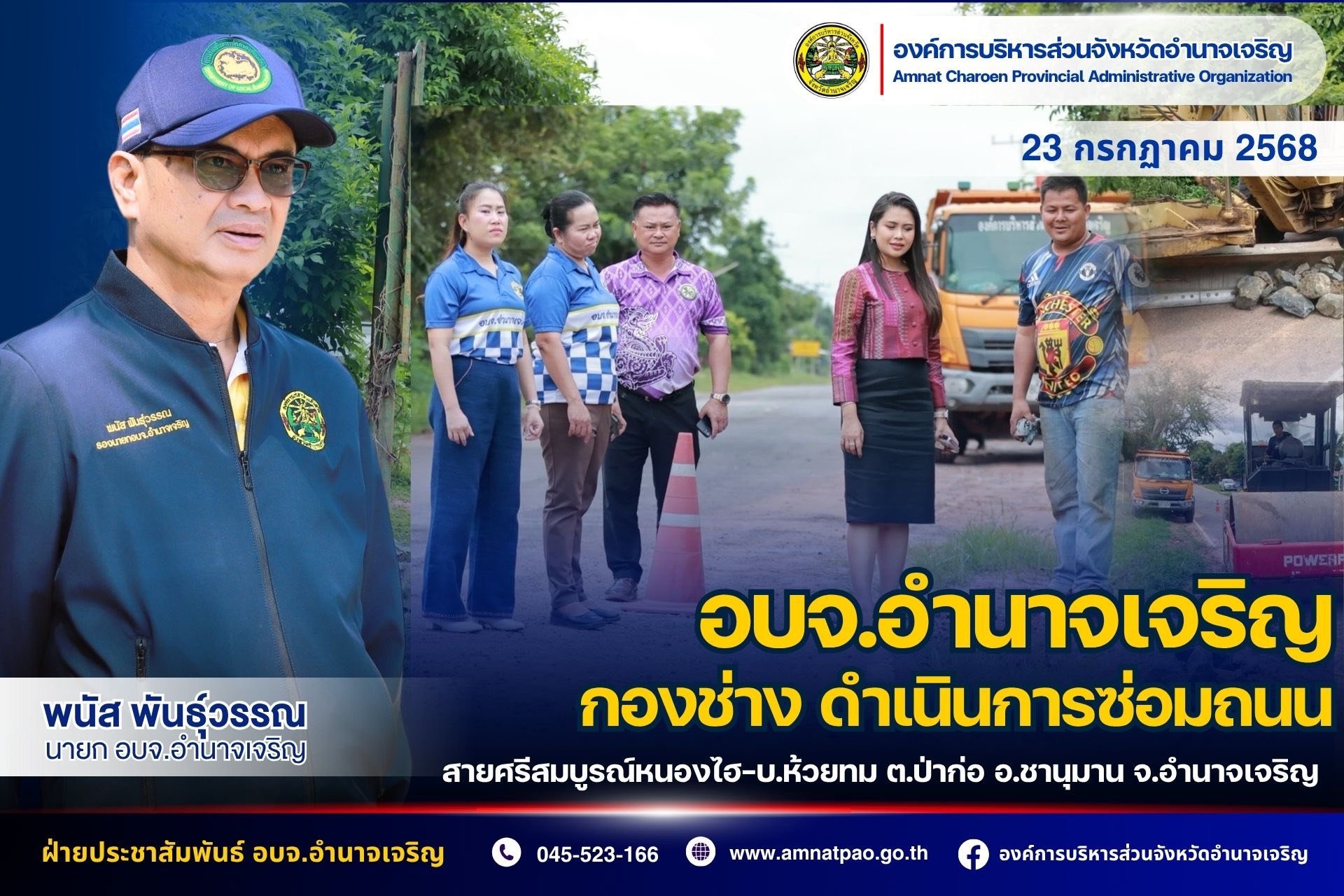 นายพนัส พันธุ์วรรณ นายก อบจ.อำนาจเจริญ มอบหมายให้นางสาวณิชชา พันธุ์วรรณ ที่ปรึกษาพิเศษ นายก อบจ.อำนาจเจริญ พร้อมด้วยนางชัญชดา สายมงคล สมาชิกสภา อบจ.อำนาจเจริญ (อ.ชานุมาน เขต2) และกองช่าง ลงพื้นที่ตรวจสอบถนนชำรุดสายบ้านศรีสมบูรณ์หนองไฮ-บ้านห้วยทม ต.ป่าก่อ อ.ชานุมาน จ.อำนาจเจริญ
