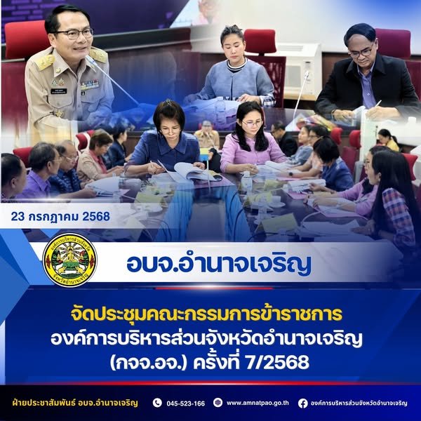 23 กรกฎาคม 2568 เวลา 13.00 น. อบจ.อำนาจเจริญ จัดประชุมคณะกรรมการข้าราชการ องค์การบริหารส่วนจังหวัดอำนาจเจริญ (กจจ.อจ.) ครั้งที่ 7/2568