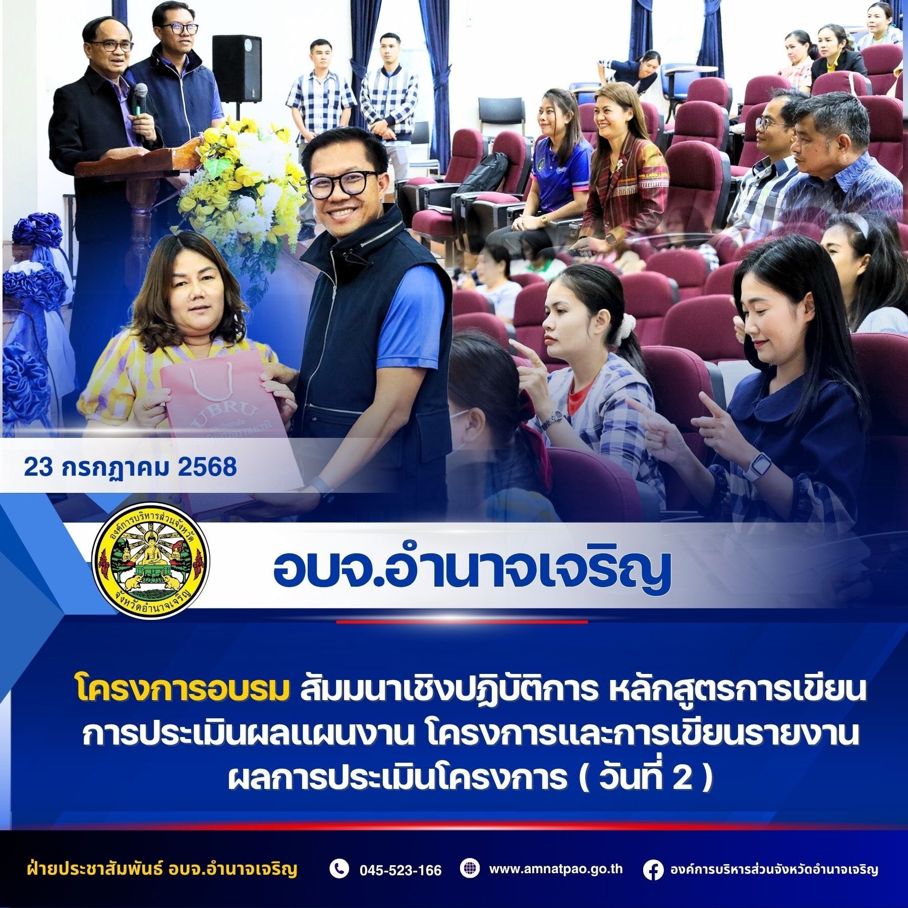 30 กรกฎาคม 2568 อบจ.อำนาจเจริญ ร่วมโครงการประชุมสัมมนาทางวิชาการเพื่อเพิ่มประสิทธิภาพในการปฏิบัติงานสำหรับบุคลากรองค์การบริหารส่วนจังหวัดภาคตะวันออกเฉียงเหนือ