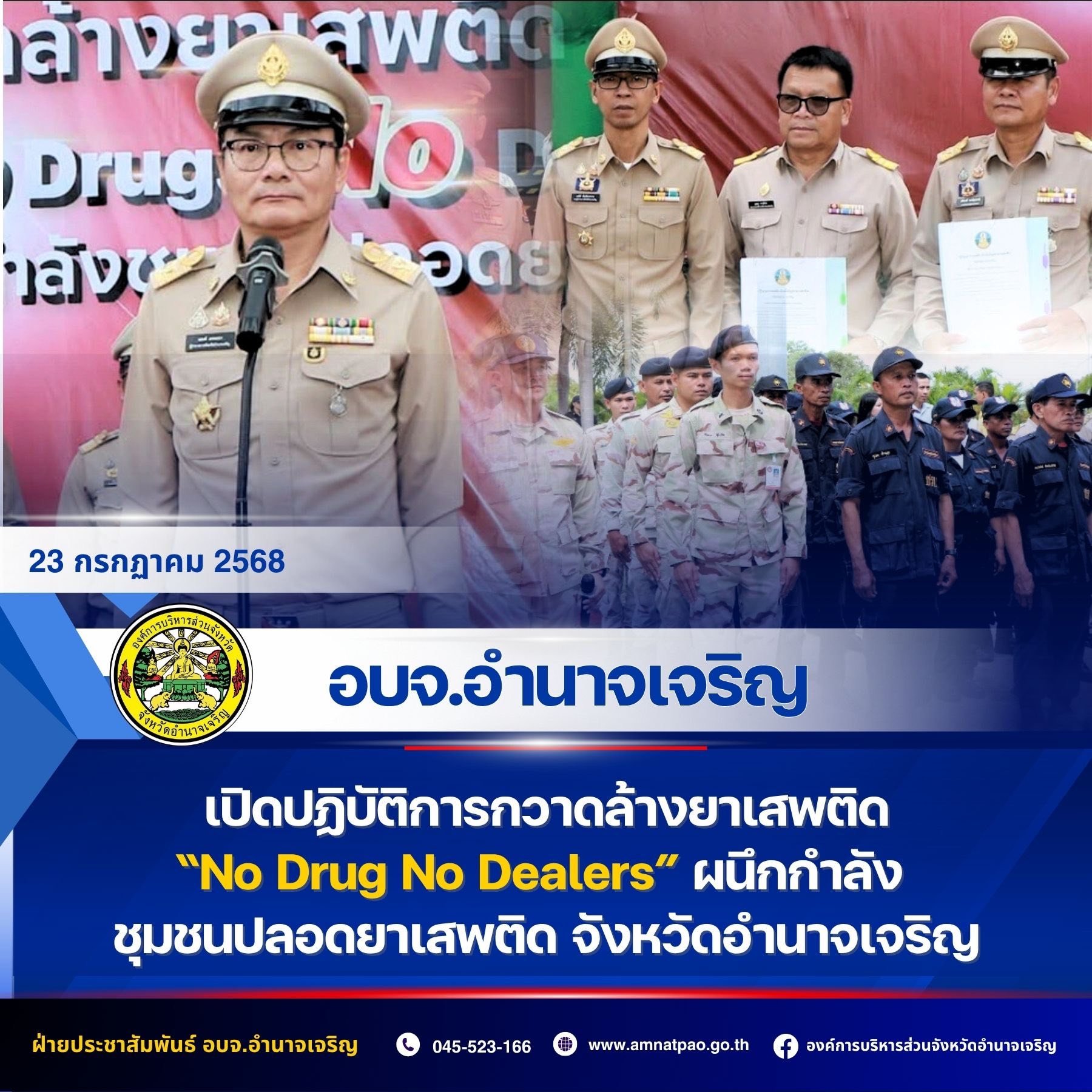 23 กรกฎาคม 68 อบจ.อำนาจเจริญ ร่วมเปิดปฏิบัติการกวาดล้างยาเสพติด "NO Drugs NO Dealer" ผนึกกำลังสร้างชุมชนปลอดยาเสพติด