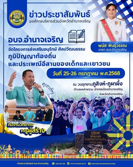อบจ.อำนาจเจริญ จัดโครงการส่งเสริมอนุรักษ์ ศิลปวัฒนธรรม ภูมิปัญญาท้องถิ่น และประเพณีอีสานของเด็กและเยาวชน ในวันที่ 25-26 กรกฎาคม 68 ณ วนอุทยานภูสิงห์-ภูผาผึ้ง ต.เหล่าพรวน อ.เมือง จ.อำนาจเจริญ