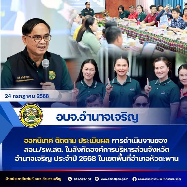 วันที่ 24 กรกฎาคม 2568 เวลา 09.00 น. อบจ.อำนาจเจริญ ออกนิเทศ ติดตาม ประเมินผลการดำเนินงานของ สอน./รพ.สต. ในสังกัดองค์การบริหารส่วนจังหวัดอำนาจเจริญ ประจำปี 2568 ในเขตพื้นที่อำเภอหัวตะพาน