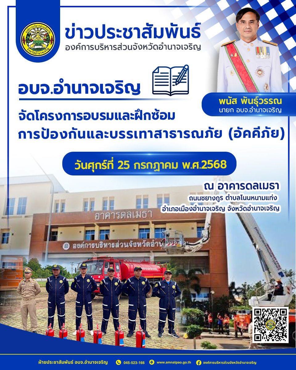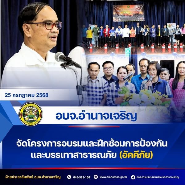 อบจ.อำนาจเจริญ จัดโครงการอบรมและฝึกซ้อมการป้องกันและบรรเทาสาธารณภัย (อัคคีภัย) ในวันศุกร์ที่ 25 กรกฎาคม 2568 ณ ห้องประชุม 180 ที่นั่ง อาคารดลเมธา อบจ.อำนาจเจริญ