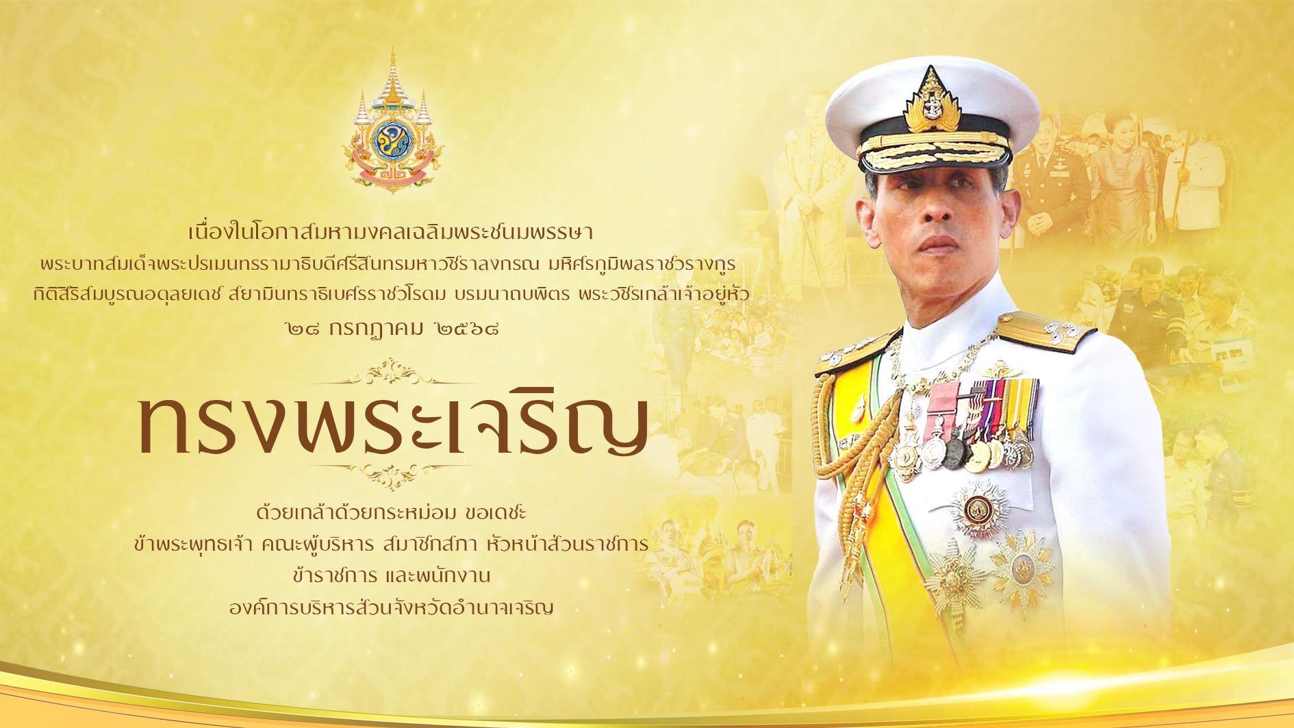 ๒๘ กรกฎาคม ๒๕๖๘ เนื่องในโอกาสวันเฉลิมพระชนมพรรษา พระบาทสมเด็จพระเจ้าอยู่หัว ทรงพระเจริญ ด้วยเกล้าด้วยกระหม่อม ขอเดชะ ข้าพระพุทธเจ้า คณะผู้บริหาร สมาชิกสภา หัวหน้าส่วนราชการ ข้าราชการ และพนักงาน องค์การบริหารส่วนจังหวัดอำนาจเจริญ