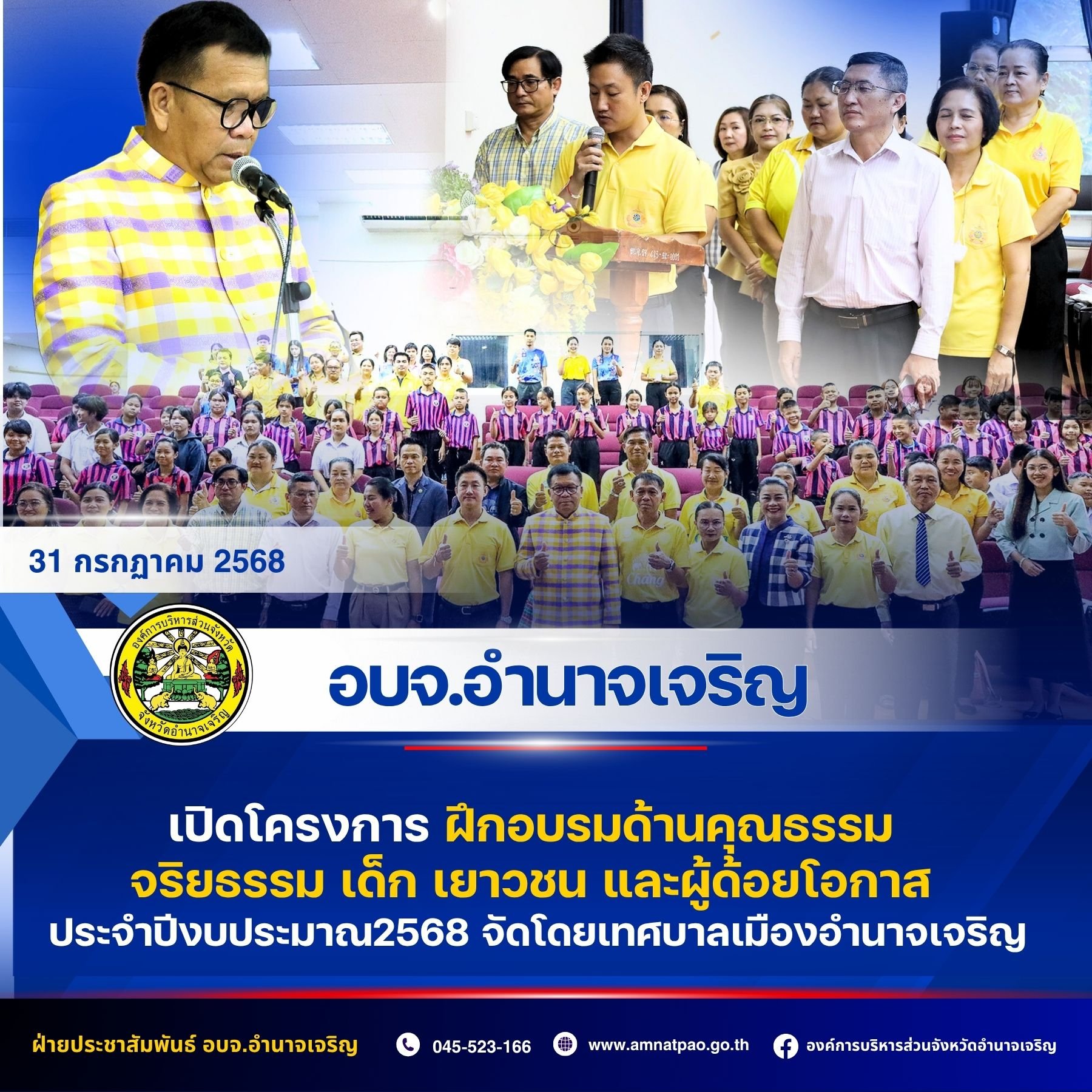 31 กรกฎาคม 2568 อบจ.อำนาจเจริญ เปิดโครงการฝึกอบรมด้านคุณธรรม จริยธรรม เด็ก เยาวชน และผู้ด้อยโอกาส ประจำปีงบประมาณ2568 จัดโดยเทศบาลเมืองอำนาจเจริญ