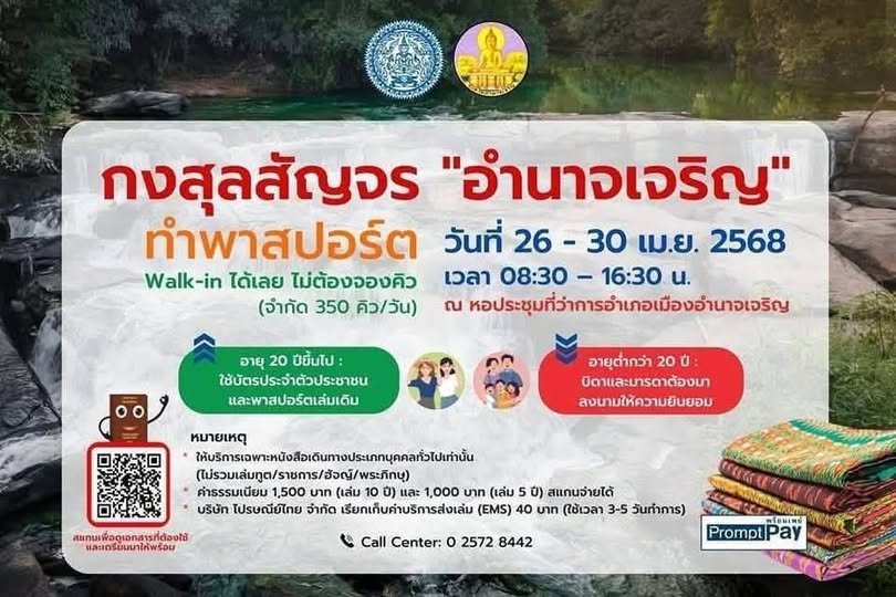 กงสุลสัญจร "อำนาจเจริญ" ทำพาสปอร์ตWalk-in ได้เลยไม่ต้องจองคิว ระหว่างวันที่ 26 - 30 เมษายน 2568 เวลา 08:30 - 16:30 น. ณ หอประชุมที่ว่าการอำเภอเมืองอำนาจเจริญ