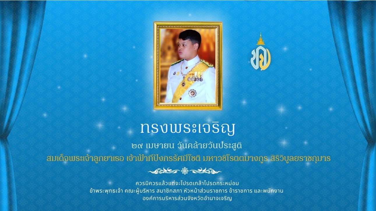 ๒๙ เมษายน ๒๕๖๘ วันคล้ายวันประสูติ สมเด็จพระเจ้าลูกยาเธอ เจ้าฟ้าทีปังกรรัศมีโชติ มหาวชิโรตตมางกูร สิริวิบูลยราชกุมาร ทรงพระเจริญ ควรมิควรแล้วแต่จะโปรดเกล้าโปรดกระหม่อม ข้าพระพุทธเจ้า คณะผู้บริหาร สมาชิกสภา หัวหน้าส่วนราชการ ข้าราชการ และพนักงานองค์การบริหารส่วนจังหวัดอำนาจเจริญ