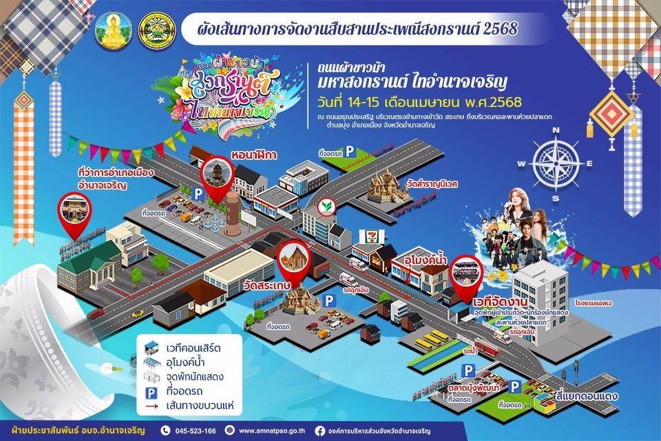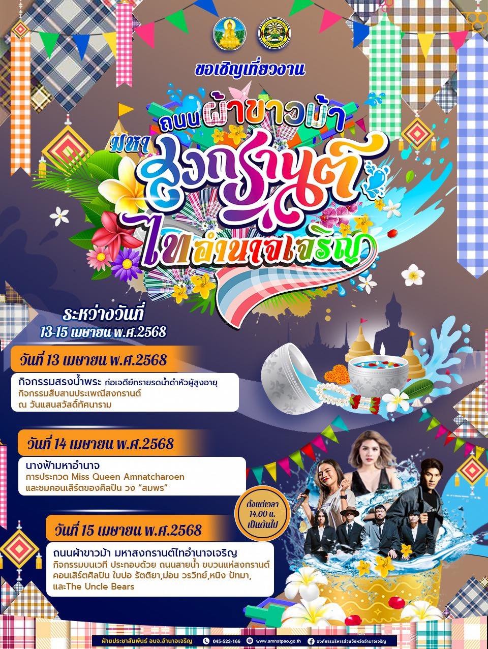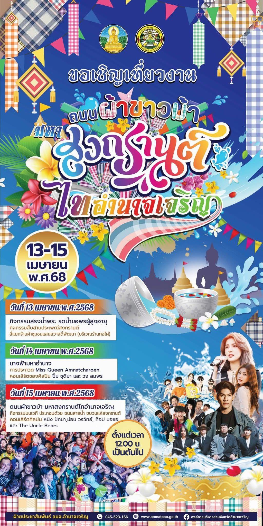 จัดยิ่งใหญ่ "สงกรานต์ไทอำนาจเจริญ" มาสนุกด้วยกันที่ ถนนผ้าขาวม้า ระหว่างวันที่ 13-15 เม.ย. 2568