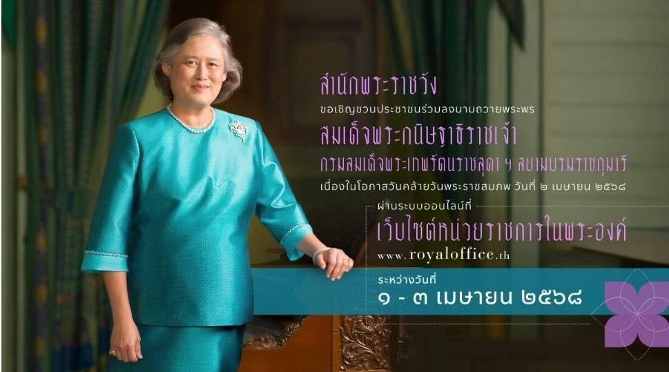 สำนักพระราชวัง ขอเชิญชวนประชาชนร่วมลงนามถวายพระพร สมเด็จพระกนิษฐาธิราชเจ้า กรมสมเด็จพระเทพรัตนราชสุดา เจ้าฟ้ามหาจักรีสิรินธร มหาวชิราลงกรณวรราชภักดี สิริกิจการิณีพีรยพัฒน รัฐสีมาคุณากรปิยชาติ สยามบรมราชกุมารี เนื่องในโอกาสวันคล้ายวันพระราชสมภพ วันที่ ๒ เมษายน ๒๕๖๘