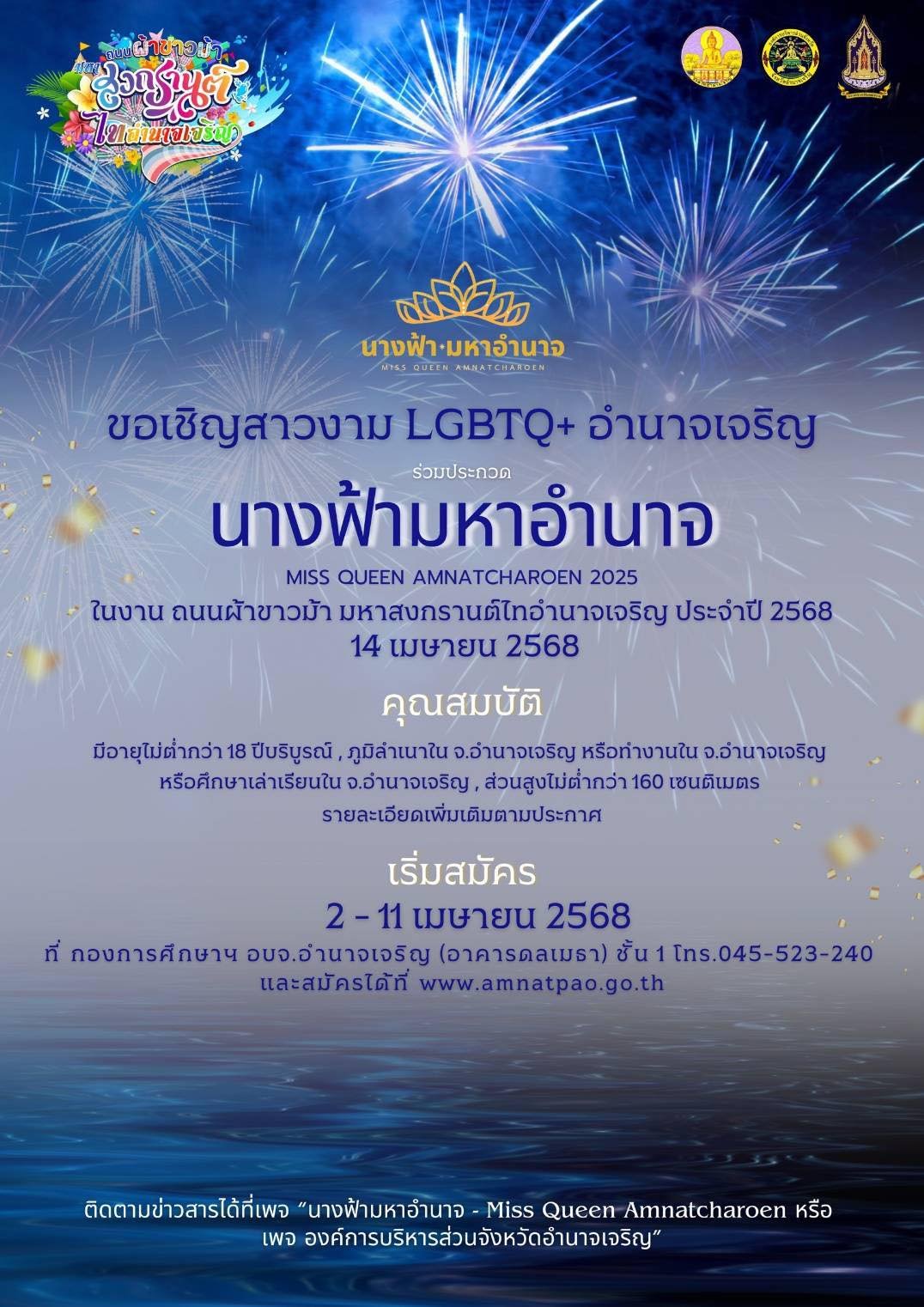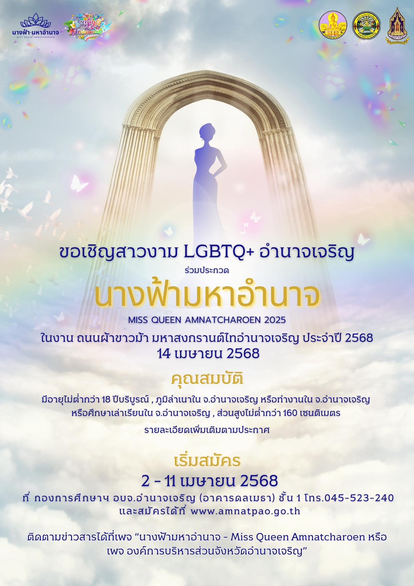 ขอเชิญสาวงาม LGBTQ+ ลูกหลานอำนาจเจริญ เข้าร่วมการประกวด นางฟ้ามหาอำนาจ Miss Queen Amnatcharoen 2025