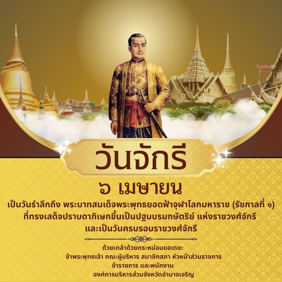 6 เมษายน วันจักรี วันรำลึกถึง พระบาทสมเด็จพระพุทธยอดฟ้าจุฬาโลกมหาราช ที่ทรงปราบดาภิเษกขึ้นเป็นปฐมบรมกษัตริย์แห่งราชวงศ์จักรี ด้วยเกล้าด้วยกระหม่อม ขอเดชะ ข้าพระพุทธเจ้า คณะผู้บริหาร สมาชิกสภา หัวหน้าส่วราชการ ข้าราขการ และพนักงาน องค์การบริหารส่วนจังหวัดอำนาจเจริญ