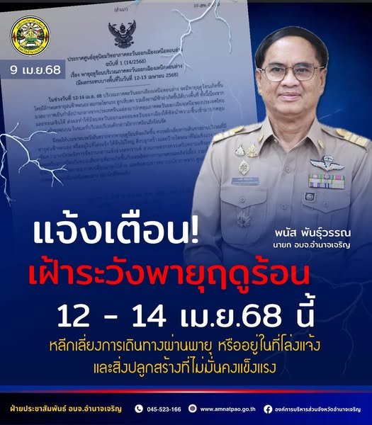 ประกาศศูนย์อุตุนิยมวิทยาภาคตะวันออกเฉียงเหนือตอนล่าง ฉบับที่ 1 (14/2568) เรื่อง พายุฤดูร้อนบริเวณภาคตะวันออกเฉียงเหนือตอนล่าง (มีผลกระทบบางพื้นที่ในวันที่ 12-13 เมษายน 2568)
