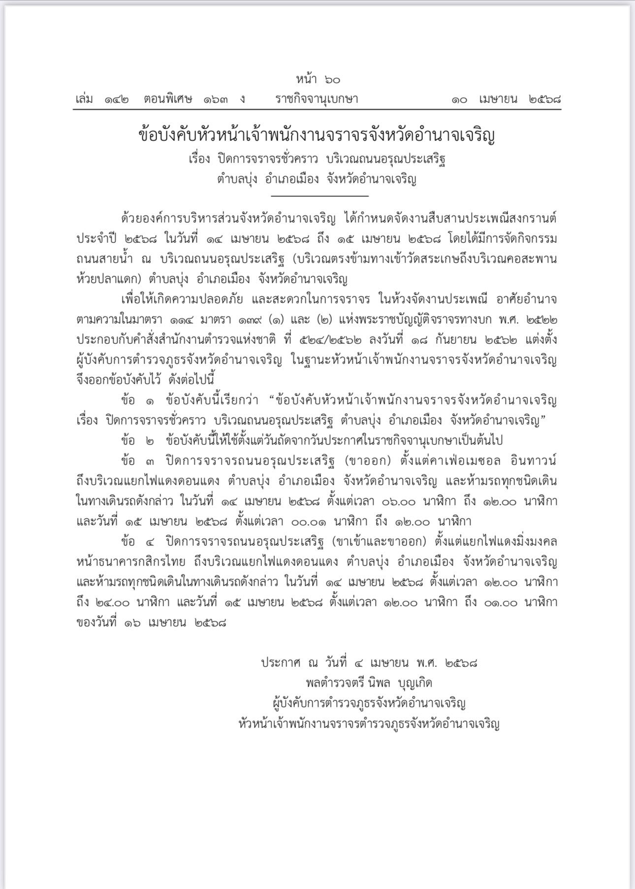 ประกาศราชกิจจานุเบกษา ข้อบังคับหัวหน้าเจ้าพนักงานจราจรจังหวัดอำนาจเจริญ เรื่อง ปิดการจราจรชั่วคราว บริเวณถนนอรุณประเสริฐ ตำบลบุ่ง อำเภอเมือง จังหวัดอำนาจเจริญ ลงวันที่ 10 เมษายน 2568