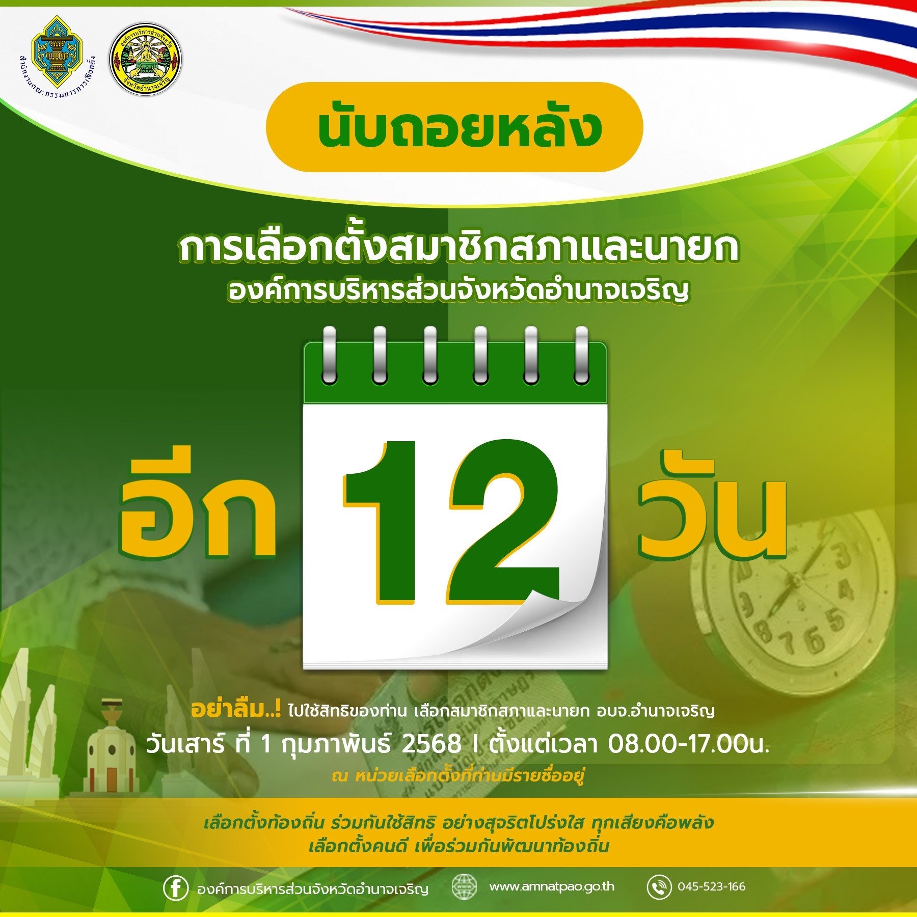 อบจ.อำนาจเจริญ | ประชาสัมพันธ์การเลือกตั้ง นับถอยหลังเหลืออีก 12 วัน ถึงวันเลือกตั้งสมาชิกสภา และ นายก อบจ.อำนาจเจริญ ในวันเสาร์ที่ 1 กุมภาพันธ์ 2568 ตั้งแต่เวลา 08.00 - 17.00 น. ณ หน่วยเลือกตั้งที่ท่านมีชื่ออยู่