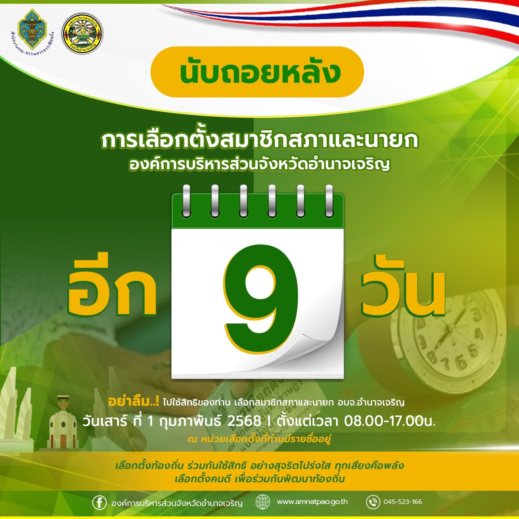 อบจ.อำนาจเจริญ | ประชาสัมพันธ์การเลือกตั้ง นับถอยหลังเหลืออีก 9 วัน ถึงวันเลือกตั้งสมาชิกสภา และ นายก อบจ.อำนาจเจริญ ในวันเสาร์ที่ 1 กุมภาพันธ์ 2568 ตั้งแต่เวลา 08.00 - 17.00 น. ณ หน่วยเลือกตั้งที่ท่านมีชื่ออยู่