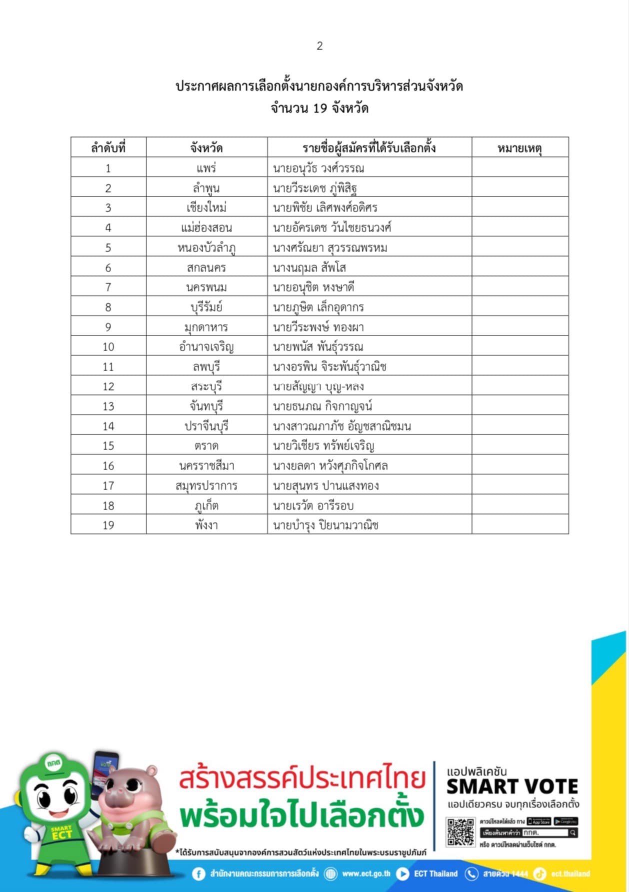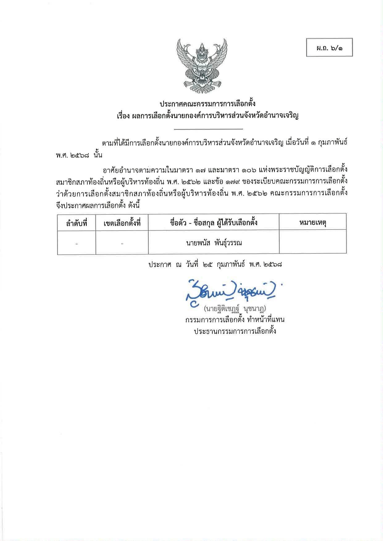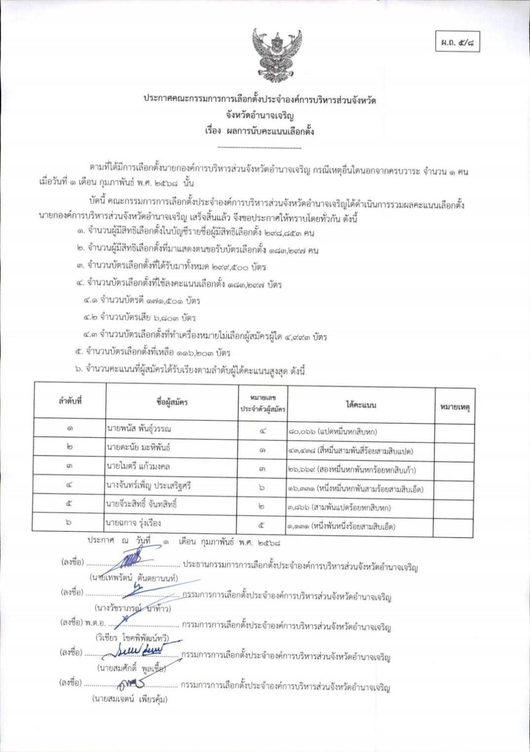 ประกาศคณะกรรมการการเลือกตั้ง เรื่อง ผลการเลือกตั้งสมาชิกสภาองค์การบริหารส่วนจังหวัดและนายกองค์การบริหารส่วนจังหวัดอำนาจเจริญ