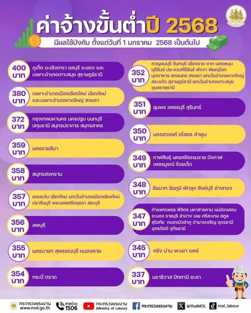 ประกาศคณะกรรมการค่าจ้าง เรื่อง อัตราค่าจ้างขั้นต่ำ (ฉบับที่ 13) ซึ่งได้ประกาศให้มีผลใช้บังคับ ตั้งแต่วันที่ 1 มกราคม 2568