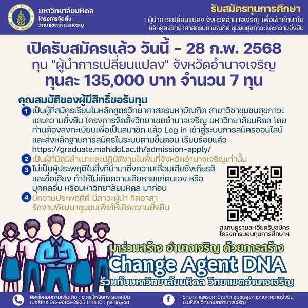 มหาวิทยาลัยมหิดล สาขาวิยาเขตอำนาจเจริญ เปิดรับสมัครทุนการศึกษา หลักสูตรวิทยาศาสตรมหาบัณฑิต สาขาวิชาชุมชนสุขภาวะและความยั่งยืน เปิดรับสมัครทุนการศึกษา ผู้นำการเปลี่ยนแปลง จังหวัดอำนาจเจริญ จำนวน 7 ทุน ทุนละ 135,000 บาท