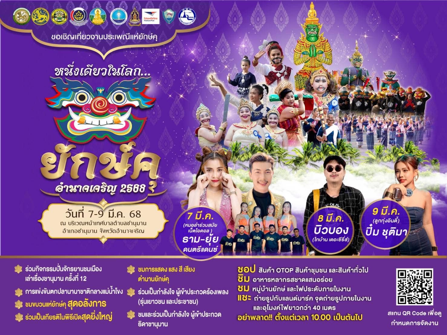 อบจ.อำนาจเจริญ ขอเชิญเที่ยวงานประเพณีแห่ยักษ์คุ “หนึ่งเดียวในโลก” ที่ อ.ชานุมาน จ.อำนาจเจริญ ในระหว่างวันที่ 7-9 มีนาคม 2568 ณ สนามหน้าเทศบาลตำบลชานุมาน อ.ชานุมาน จ.อำนาจเจริญ