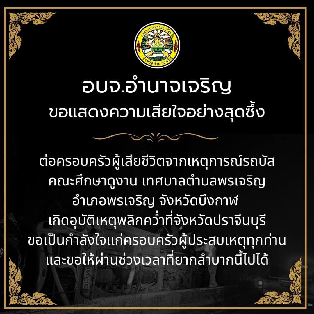 อบจ.อำนาจเจริญ ขอแสดงความเสียใจอย่างสุดซึ้ง ต่อครอบครัวผู้เสียชีวิตจากเหตุการณ์รถบัส คณะศึกษาดูงาน เทศบาลตำบลพรเจริญ อำเภอพรเจริญ จังหวัดบึงกาฬ เกิดอุบัติเหตุพลิกคว่ำ ที่จังหวัดปราจีนบุรี ขอเป็นกำลังใจแก่ครอบครัวผู้ประสบเหตุทุกท่าน และขอให้ผ่านช่วงเวลาที่ยากลำบากนี้ไปได้