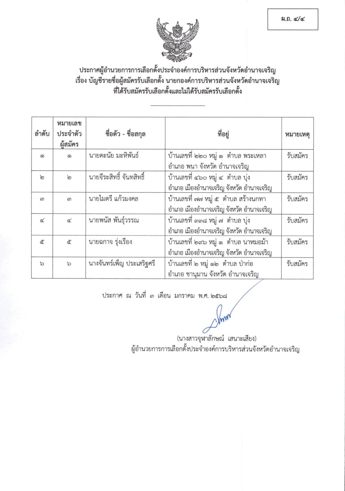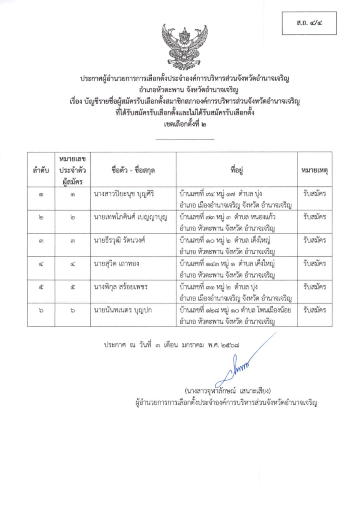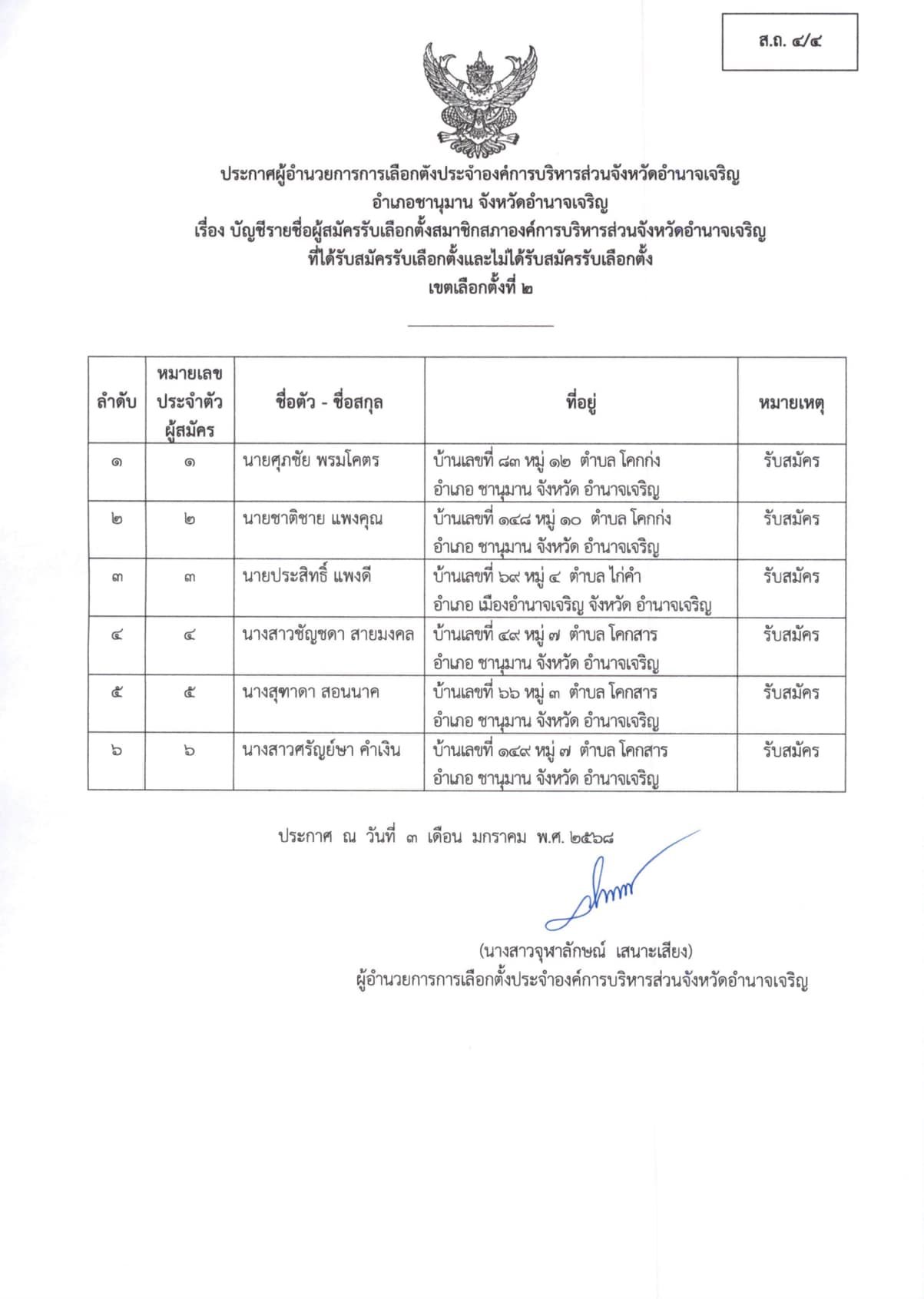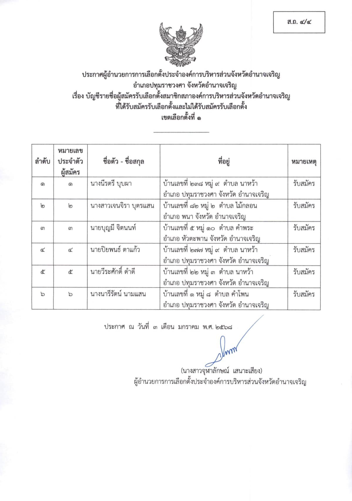 ประกาศผู้อำนวยการการเลือกตั้งประจำองค์การบริหารส่วนจังหวัดอำนาจเจริญ เรื่อง ประกาศบัญชีรายชื่อผู้สมัครรับเลือกตั้ง นายก อบจ.อำนาจเจริญ ผู้ที่ได้รับสมัครรับเลือกตั้งฯ (ผ.ถ.4/4 และ ผ.ถ. 4/5) “เลือกตั้งท้องถิ่นร่วมกันใช้สิทธิอย่างสุจริตโปร่งใส สร้างสรรค์ประเทศไทยพร้อมใจไปเลือกตั้ง”