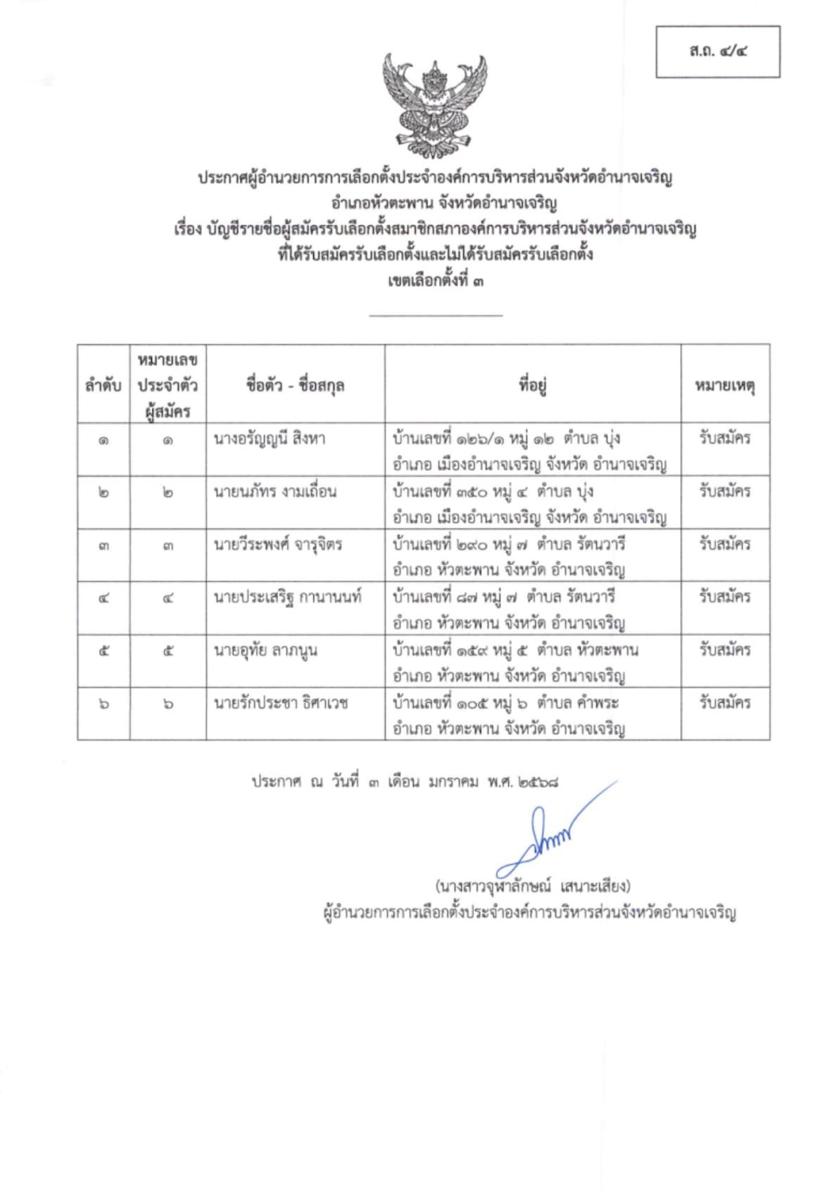 ประกาศผู้อำนวยการการเลือกตั้งประจำองค์การบริหารส่วนจังหวัดอำนาจเจริญ เรื่อง ประกาศบัญชีรายชื่อผู้สมัครรับเลือกตั้ง สมาชิกสภา อบจ.อำนาจเจริญ ผู้ที่ได้รับสมัครรับเลือกตั้งฯ และผู้ที่ไม่ได้รับสมัครรับเลือกตั้งฯ (ส.ถ.4/4 และ ส.ถ. 4/5) อำเภอหัวตะพาน เขตเลือกตั้งที่ 3 “เลือกตั้งท้องถิ่นร่วมกันใช้สิทธิอย่างสุจริตโปร่งใส สร้างสรรค์ประเทศไทยพร้อมใจไปเลือกตั้ง”