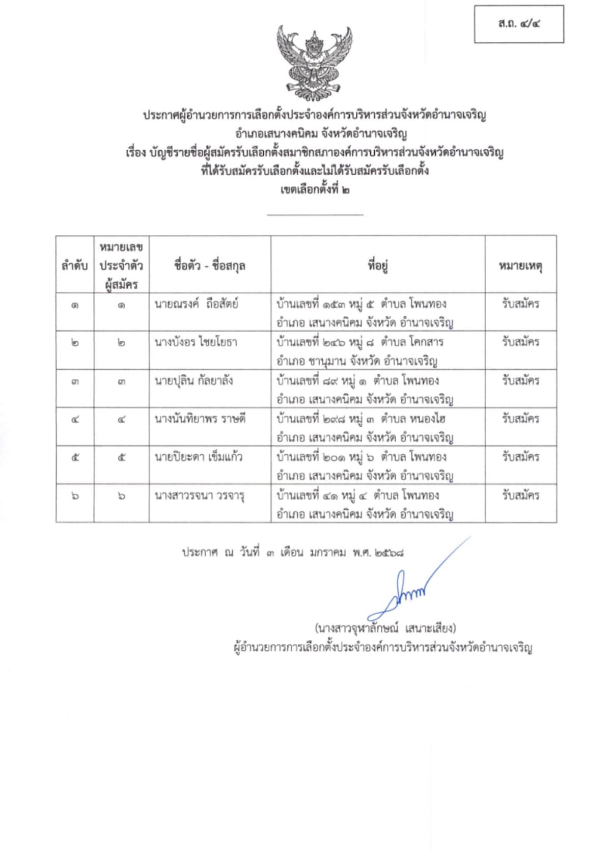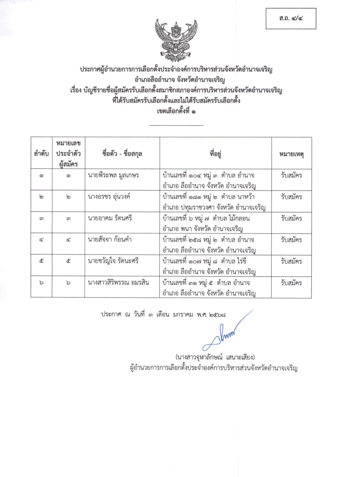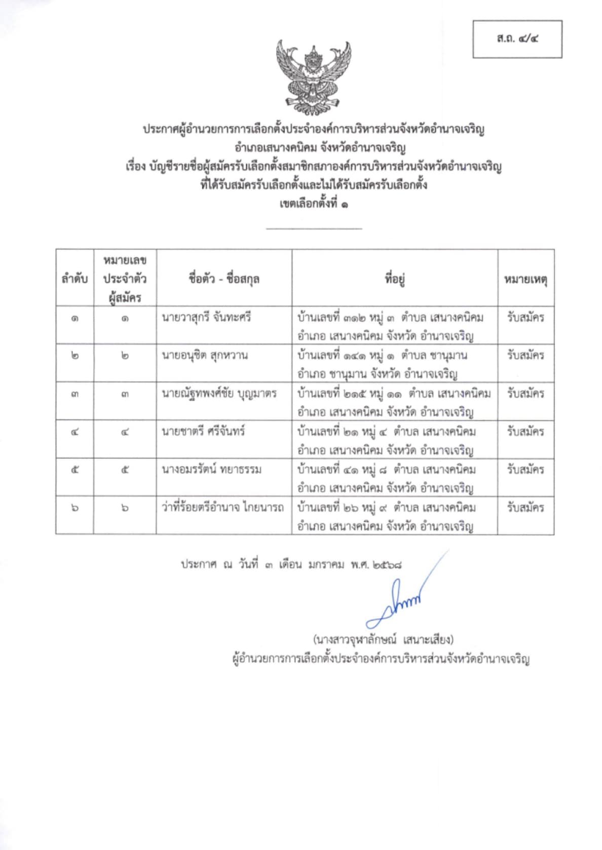 ประกาศผู้อำนวยการการเลือกตั้งประจำองค์การบริหารส่วนจังหวัดอำนาจเจริญ เรื่อง ประกาศบัญชีรายชื่อผู้สมัครรับเลือกตั้ง สมาชิกสภา อบจ.อำนาจเจริญ ผู้ที่ได้รับสมัครรับเลือกตั้งฯ และผู้ที่ไม่ได้รับสมัครรับเลือกตั้งฯ (ส.ถ.4/4 และ ส.ถ. 4/5) อำเภอเสนางคนิคม เขตเลือกตั้งที่ 1 “เลือกตั้งท้องถิ่นร่วมกันใช้สิทธิอย่างสุจริตโปร่งใส สร้างสรรค์ประเทศไทยพร้อมใจไปเลือกตั้ง”